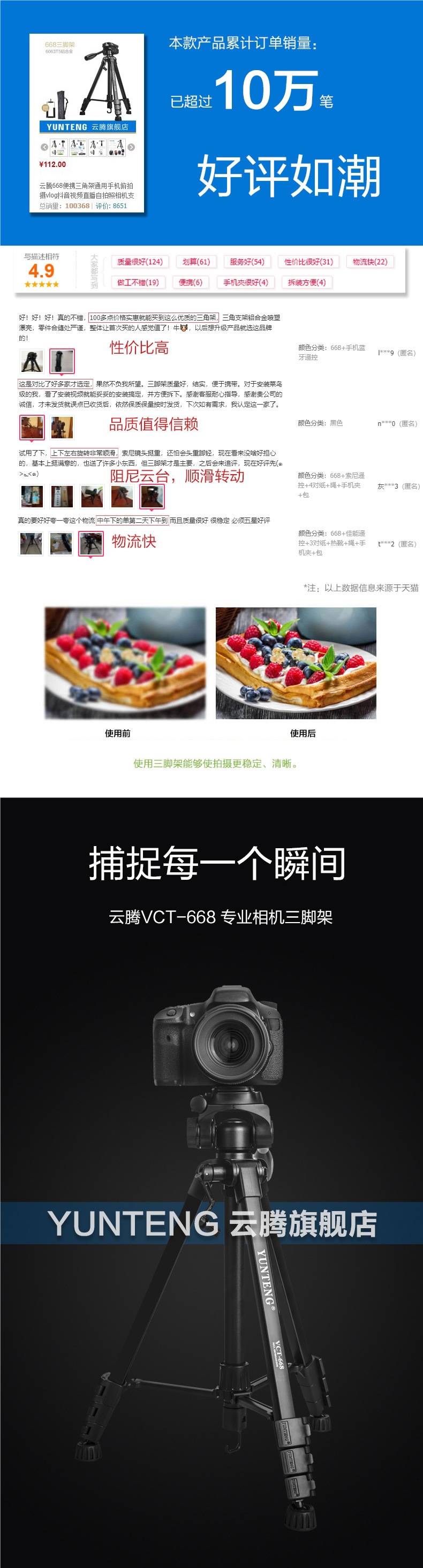 • [삼각대 2.208m 개] + 수평 및 수직 회전 휴대폰 홀더 + Yunteng 휴대폰 블루투스 리모컨 + 보관 가방 포함 + 휴대폰 데스크탑 스탠드