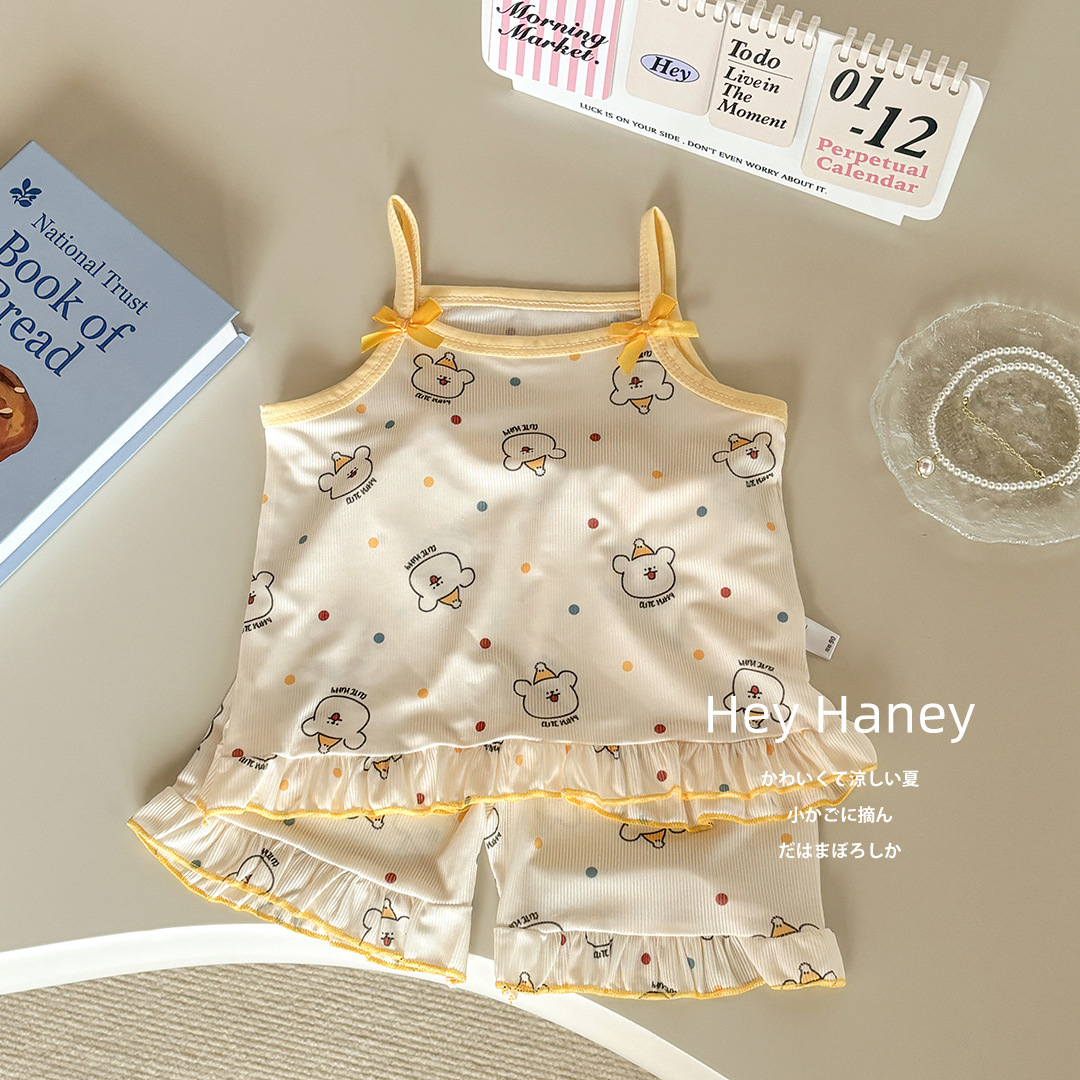 2025 여름 어린이 서스펜더 꽃 정장 소녀 민소매 반바지 투피스 얼음 느낌 통기성 만화 가정 옷