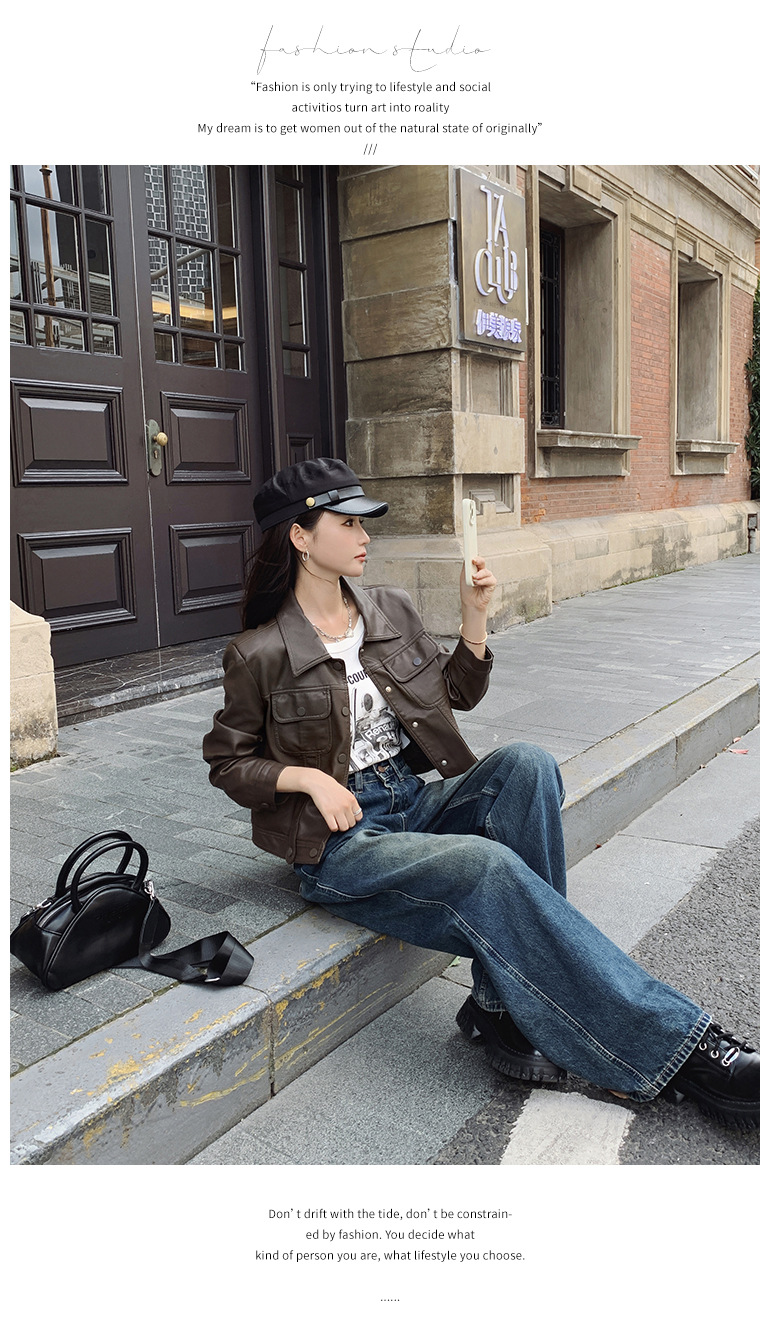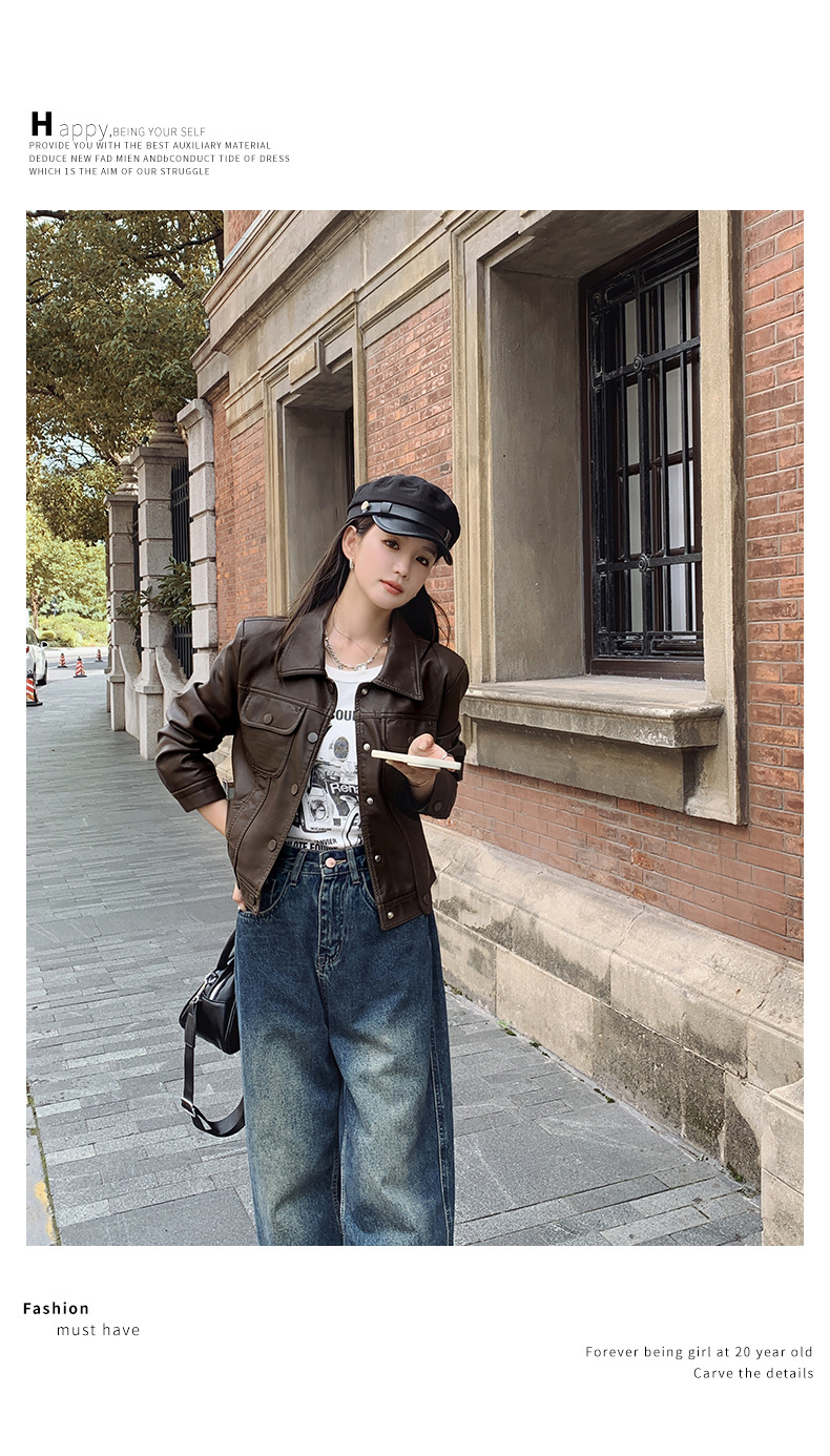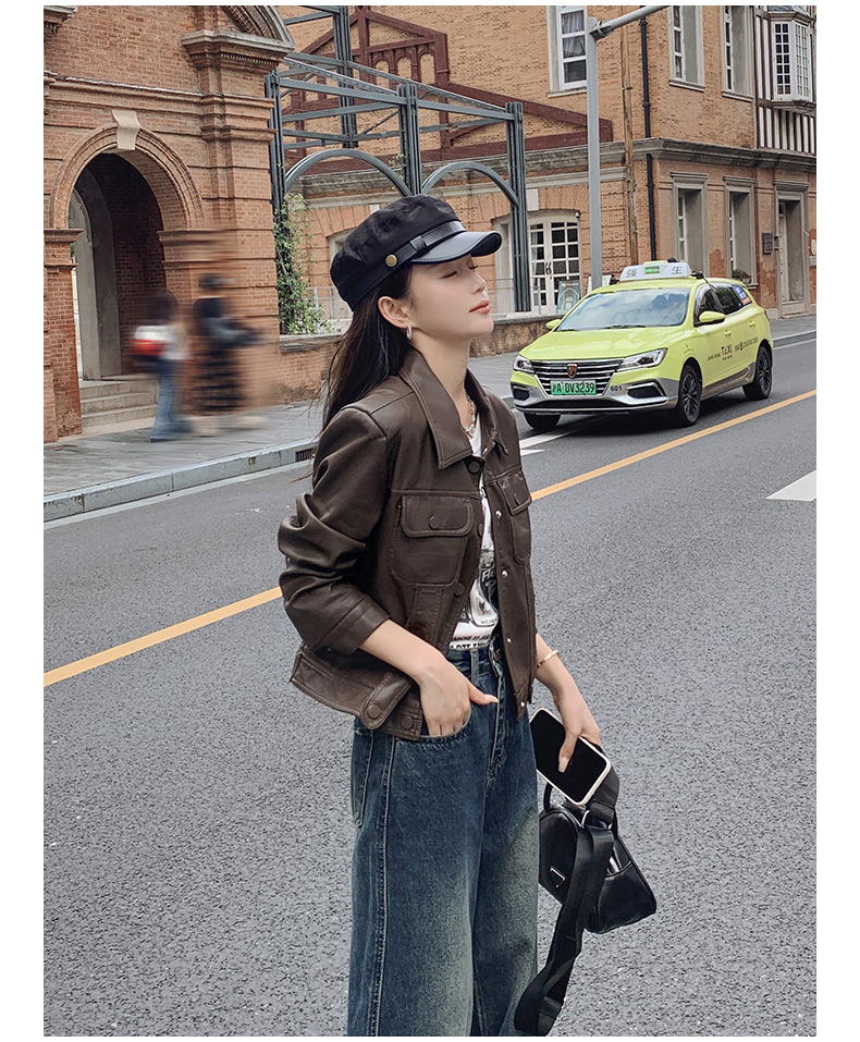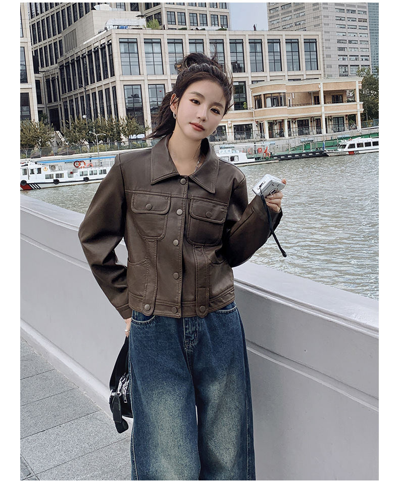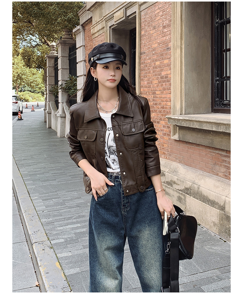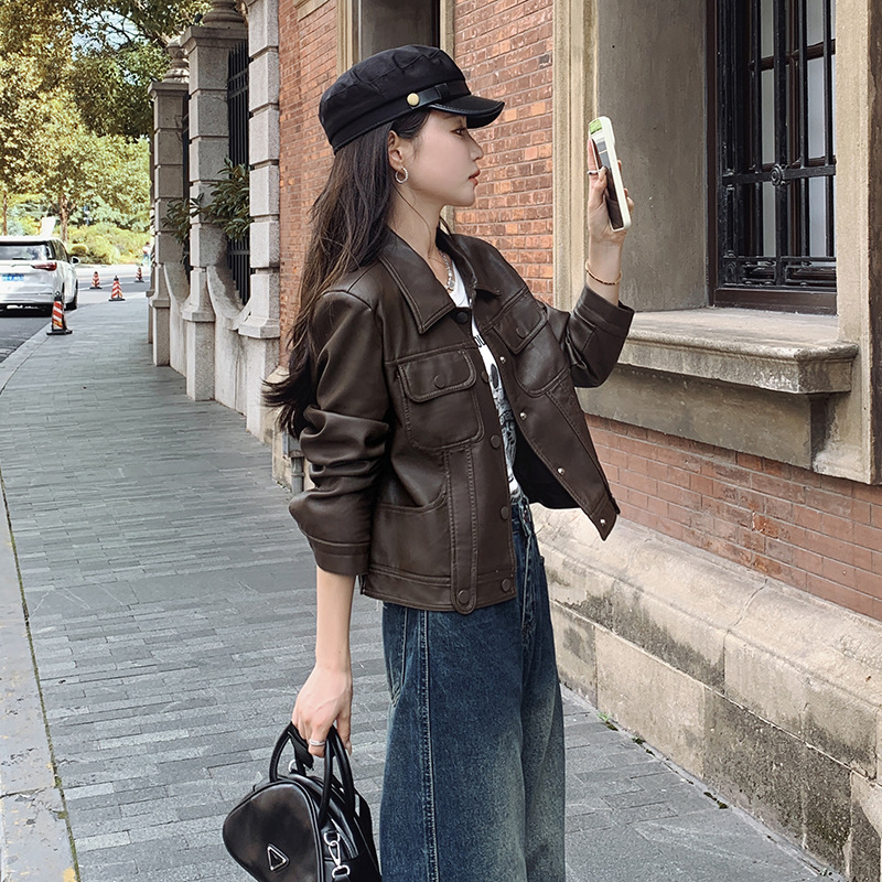 여성을위한 갈색 짧은 가죽 자켓 가을 2025 새로운 홍콩 스타일 복고풍 스트리트 pu 가죽 자켓 메일 라드 착용