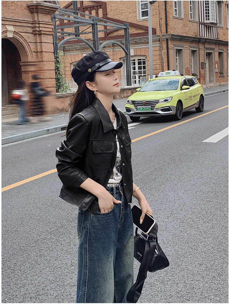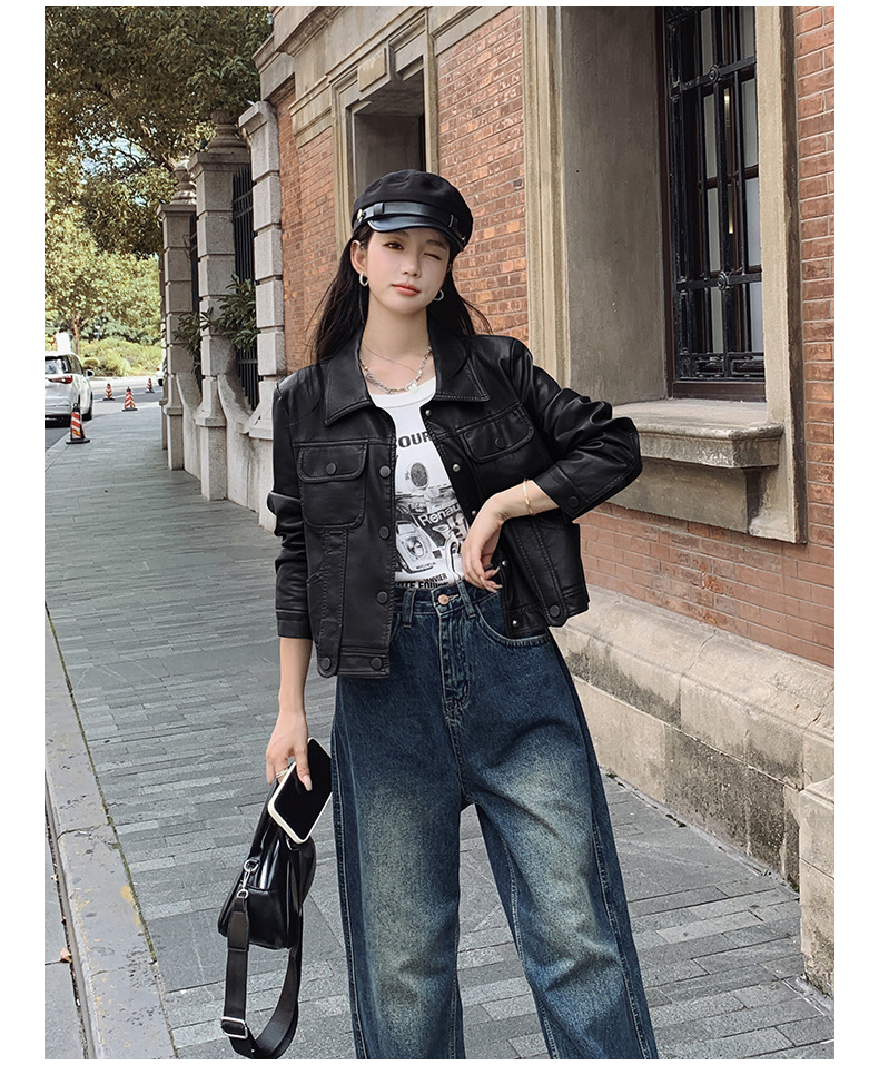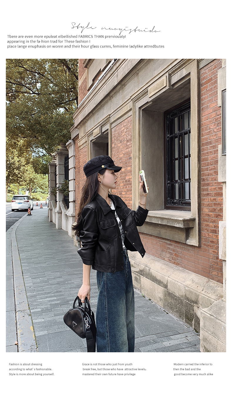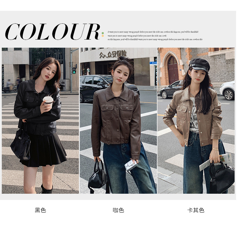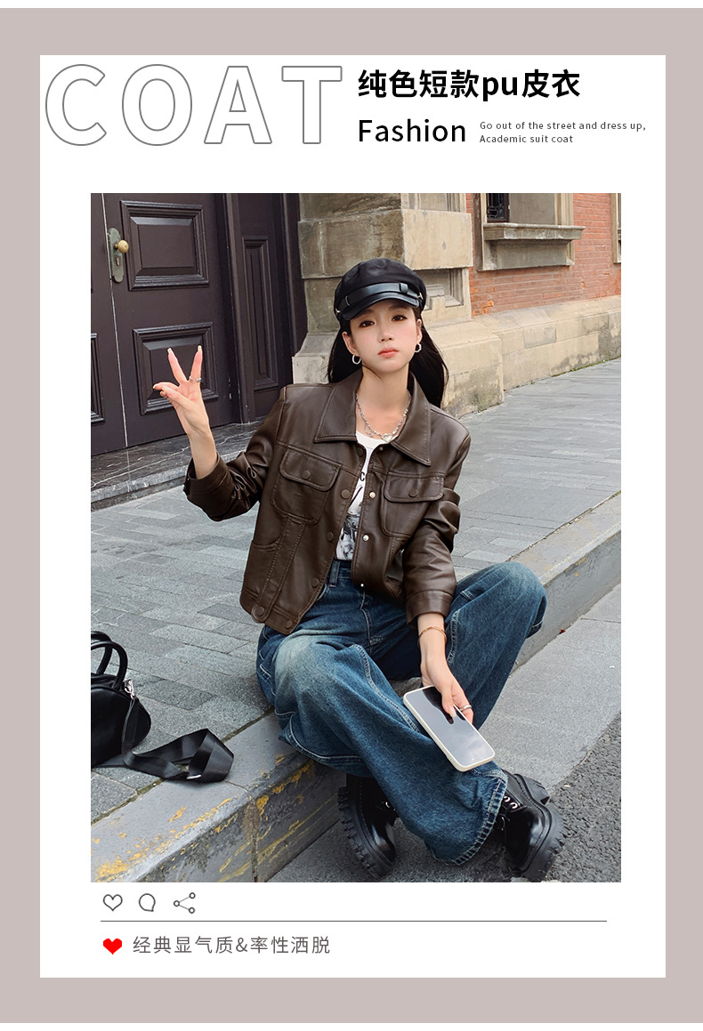 여성을위한 갈색 짧은 가죽 자켓 가을 2025 새로운 홍콩 스타일 복고풍 스트리트 pu 가죽 자켓 메일 라드 착용