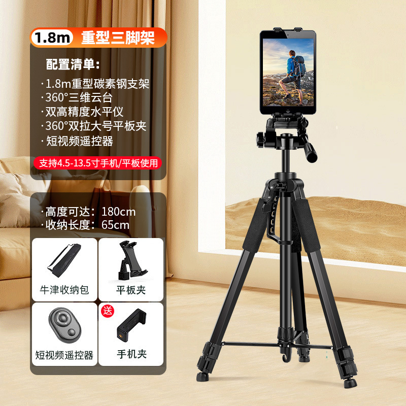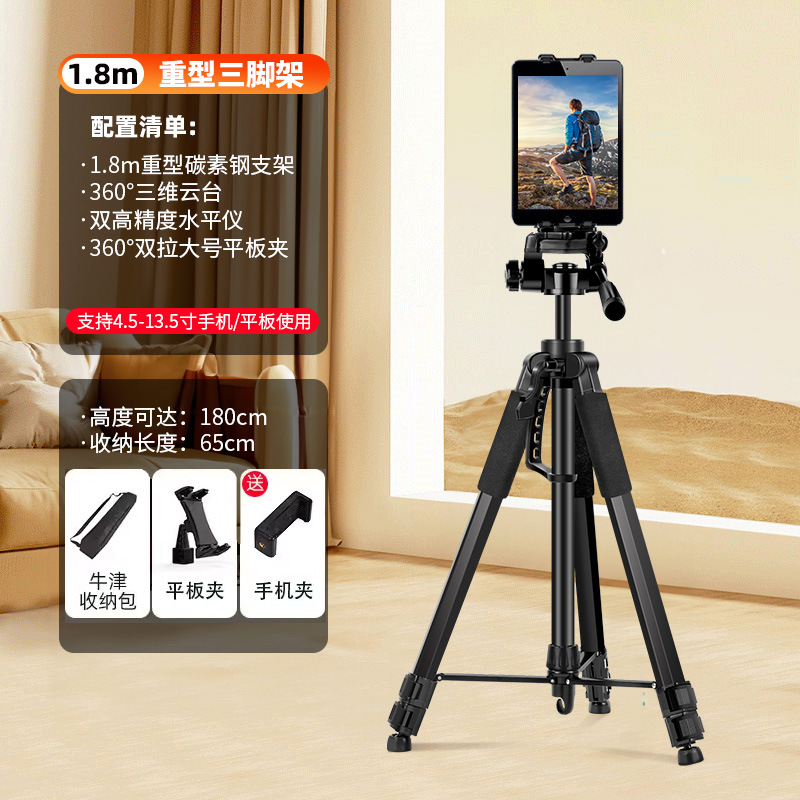 • [헤비듀티] 1.8m 삼각대 - 360도 대형 태블릿 클립 + 셀카 + 무료 보관 가방