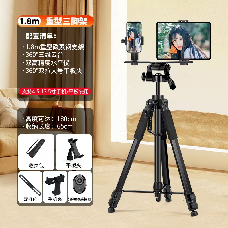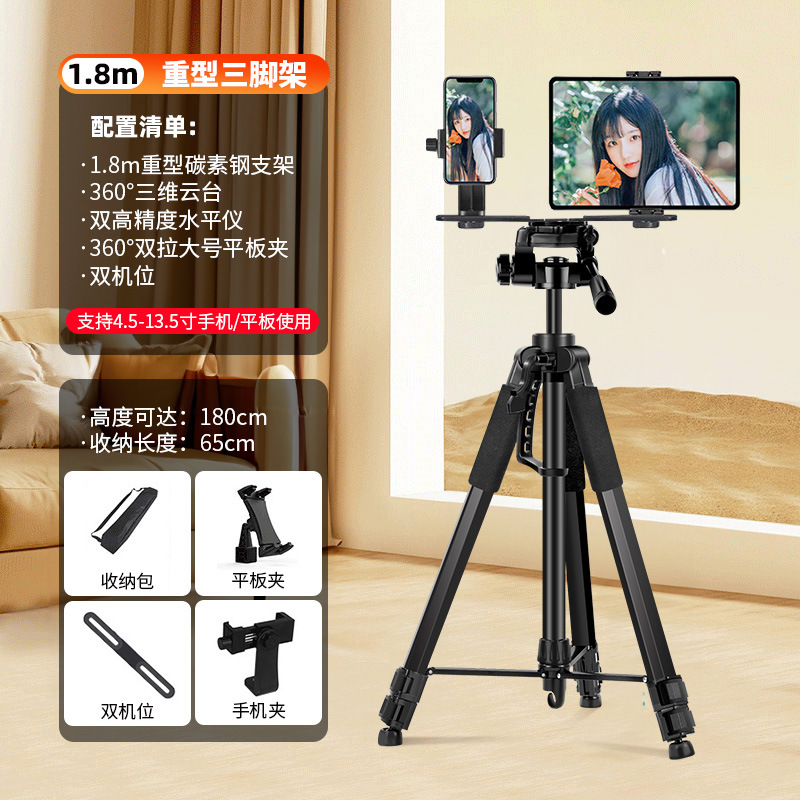 • [헤비듀티] 1.8m 삼각대 - 태블릿 및 휴대폰용 듀얼 카메라 + 무료 보관 가방