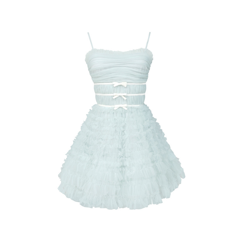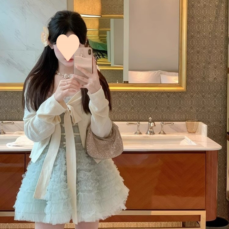 플러스 사이즈 여성 여름 헤비 리본 쉬폰 거즈 서스펜더 공주 드레스 + 중공 니트 스웨터 투피스 세트스토어 가기