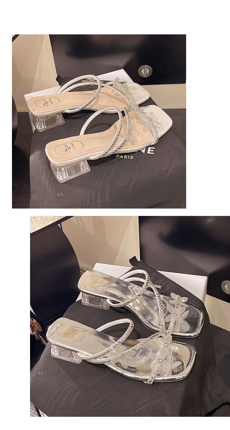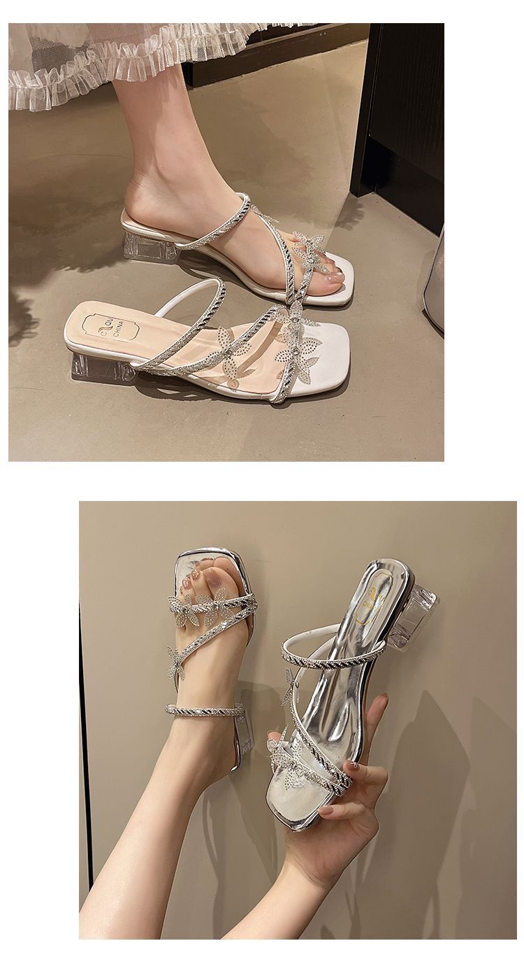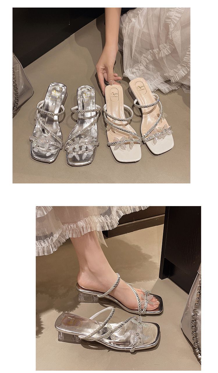 여성을 위한 스커트가 있는 세련된 프렌치 스타일, 화이트 두꺼운 굽 샌들, 2025 크리스탈 핫 스타일 새 샌들, 아름다운 꽃스토어 가기