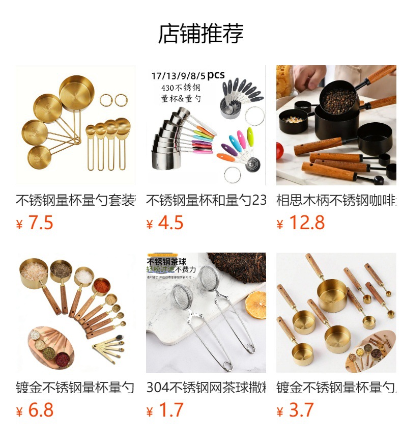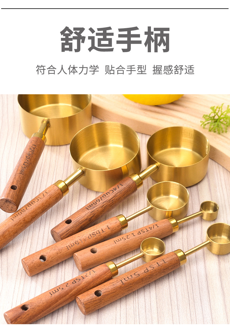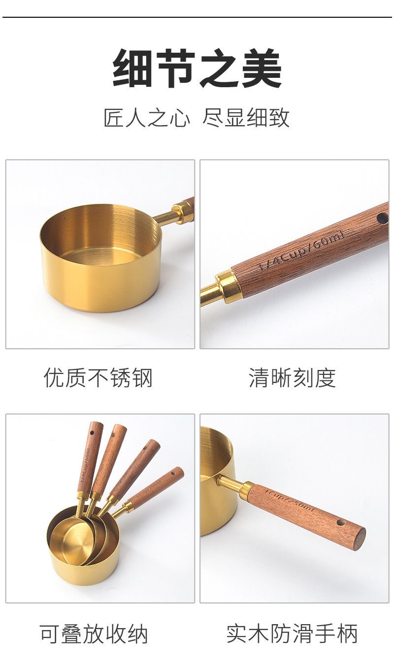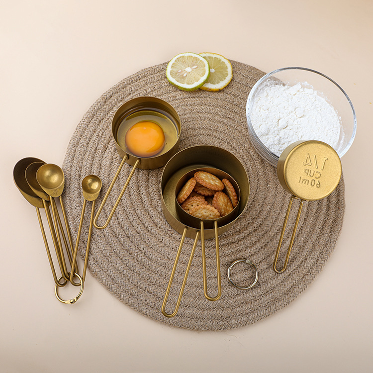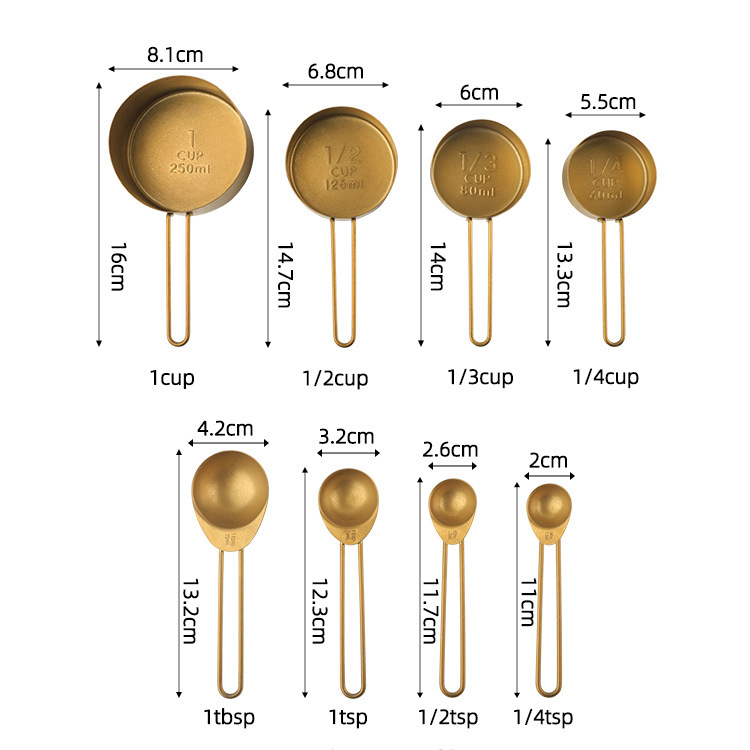 • 스테인리스 와이어 손잡이가 있는 금 계량컵 + 계량스푼(8개 세트)
