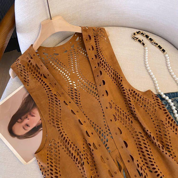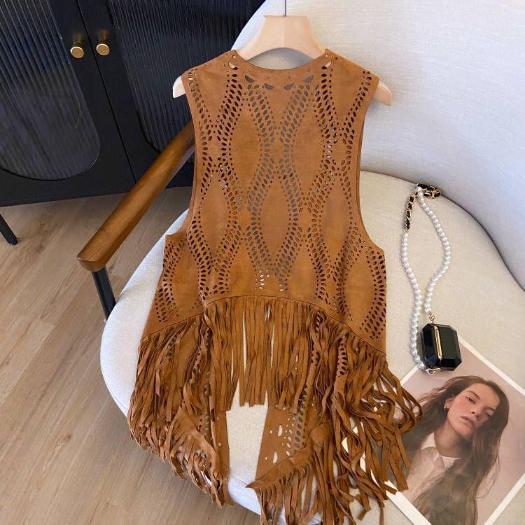 웨스턴 카우보이 방랑 스타일 복고풍 스웨이드 태슬 중공 얇은 양복 조끼 여성을위한 신장 여행 외부 조끼스토어 가기
