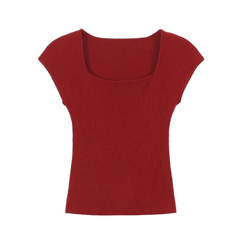 여성을위한 스퀘어 넥 반팔 니트 티셔츠 여름 2025 새로운 순수한 욕망 핫 소녀 짧은 슬림 피트 셔츠 탑스토어 가기