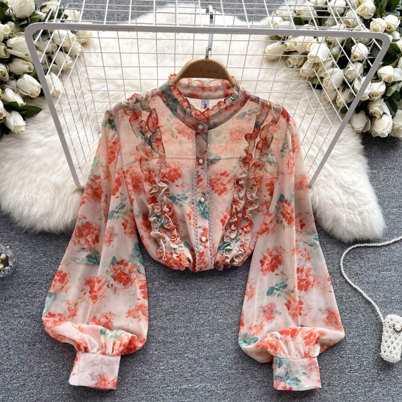 여성을위한 프렌치 스위트 프린트 쉬폰 셔츠 봄 디자인 여성을위한 세련된 러플 랜턴 슬리브 탑스토어 가기