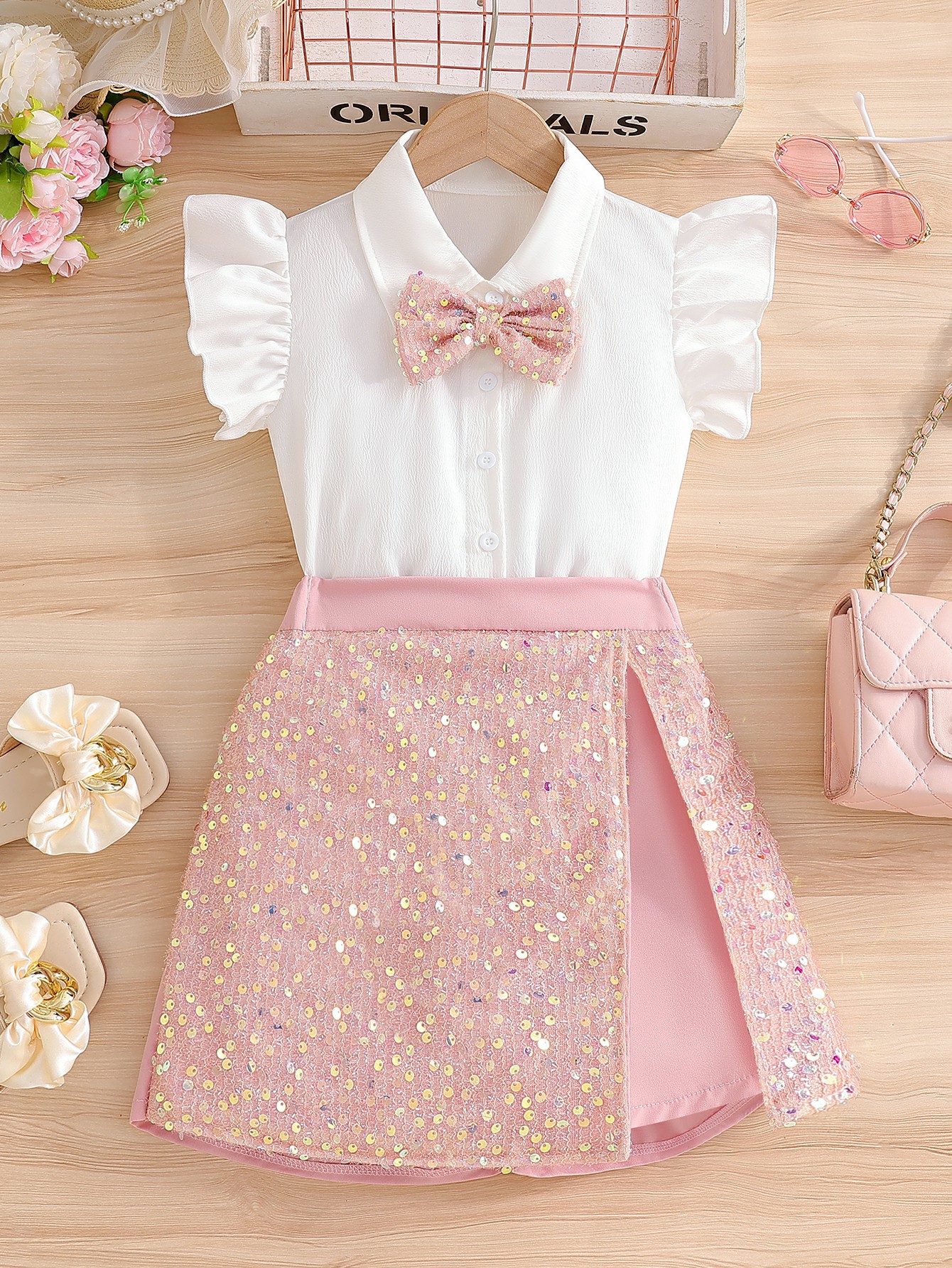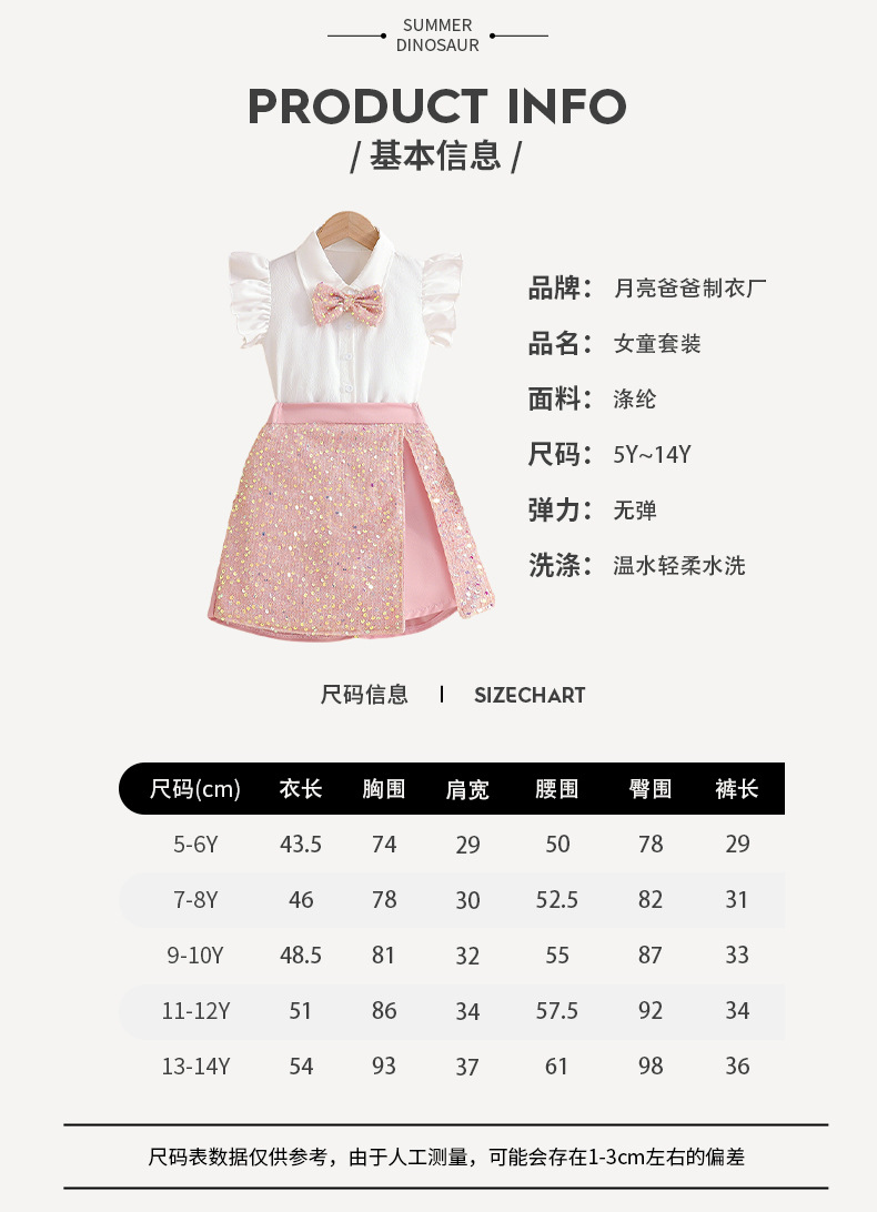 국경 간 소녀 여름 스커트 정장 핑크 스팽글 스커트 플라잉 슬리브 보우 타이 어린이 스팽글 스커트