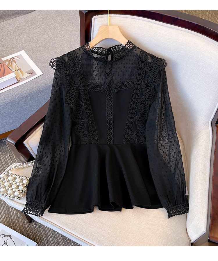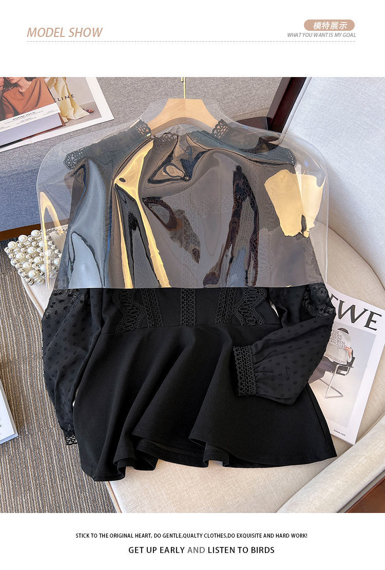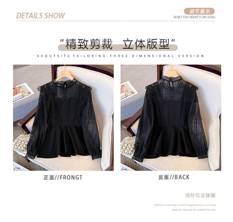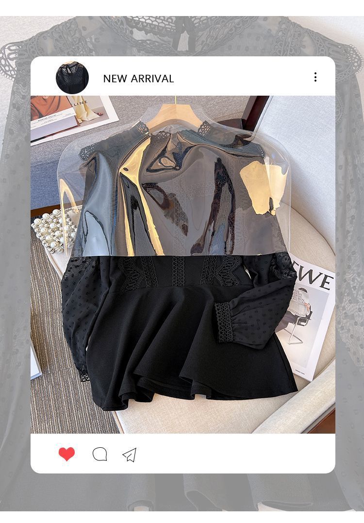 플러스 사이즈 여성의 초가을 겨울 새로운 스타일 뚱뚱한 소녀 쉬폰 셔츠, 세련된 배 커버 디자인, 슬리밍 레이스 탑