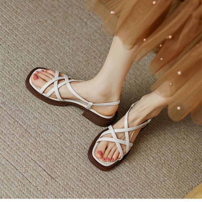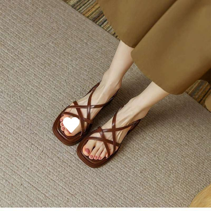 발을 희게~못보이게~브라운 레트로 우븐 로마 샌들 2025 여름 소프트솔 플랫 플러스사이즈 여성화 41스토어 가기