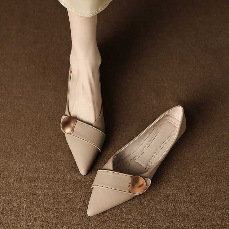 패셔너블한 플랫 포인티드 토 여성화 2025 신상 여름 프렌치 스타일 니치 보트 슈즈 살구 버튼