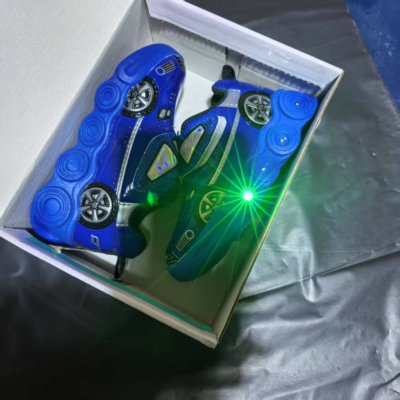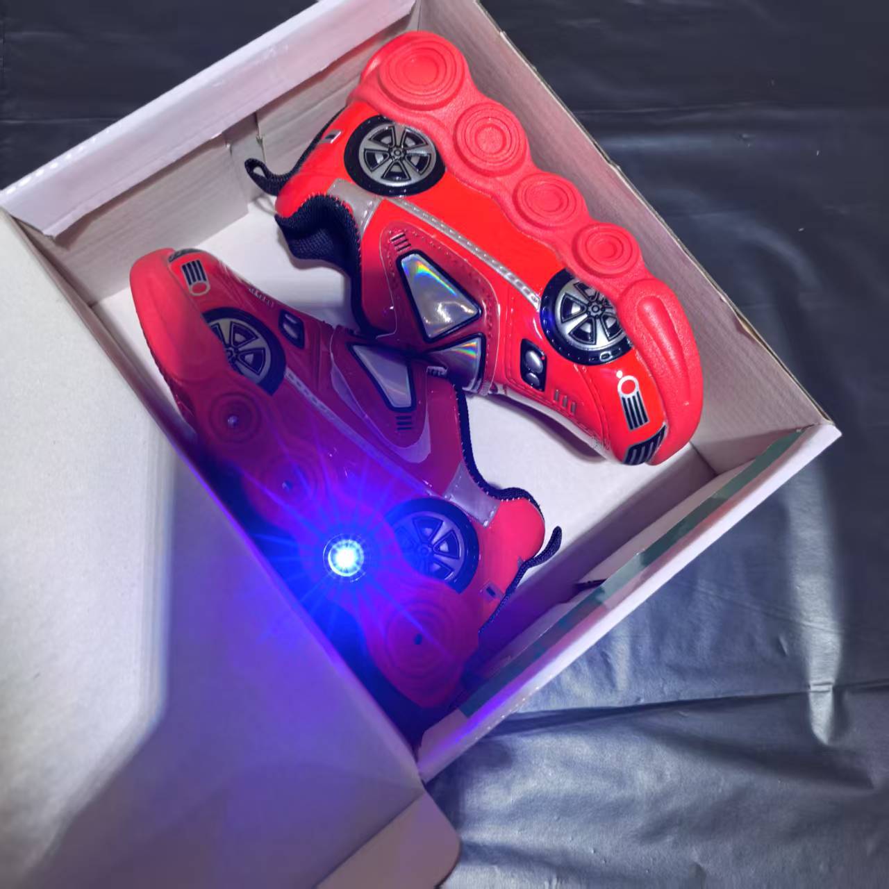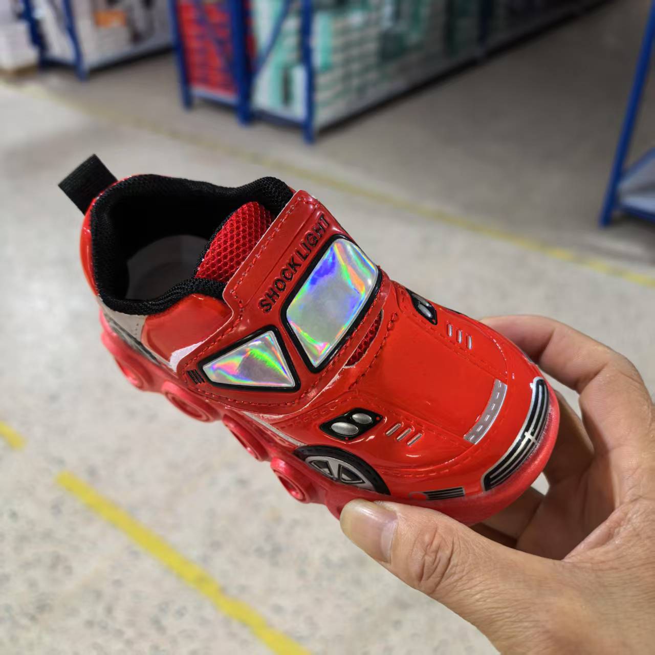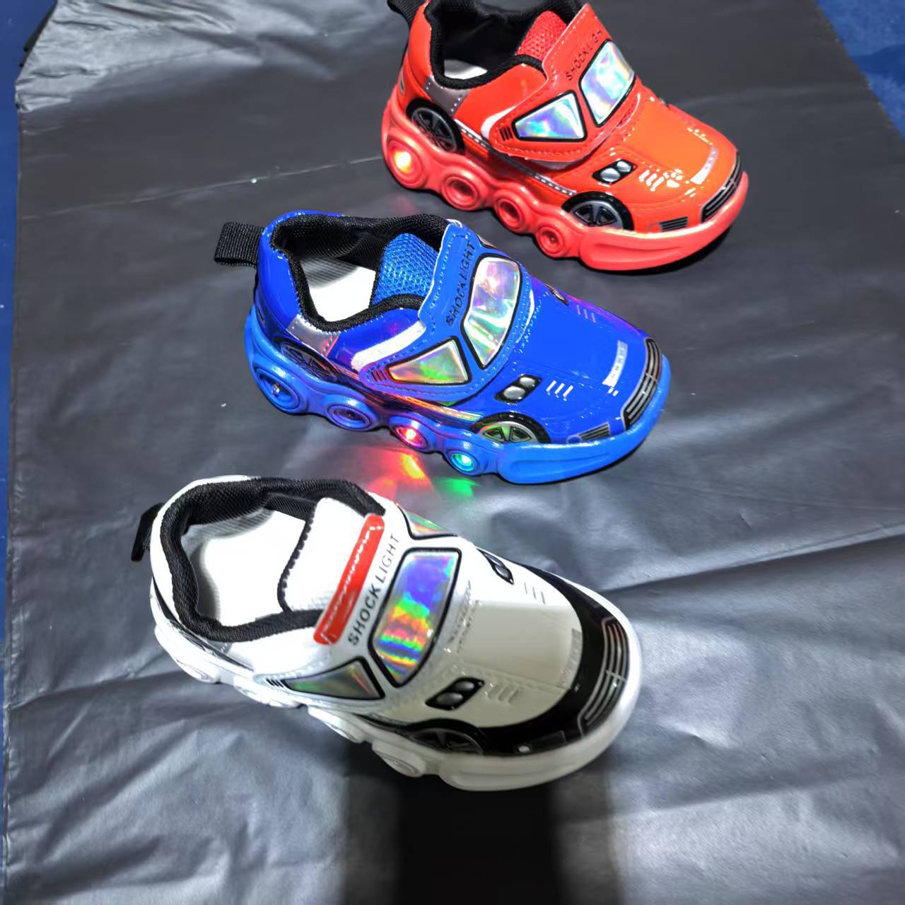 此款是镜面材料,皮面是发亮的,鞋底是环保材料,灯是大电池还有感应的