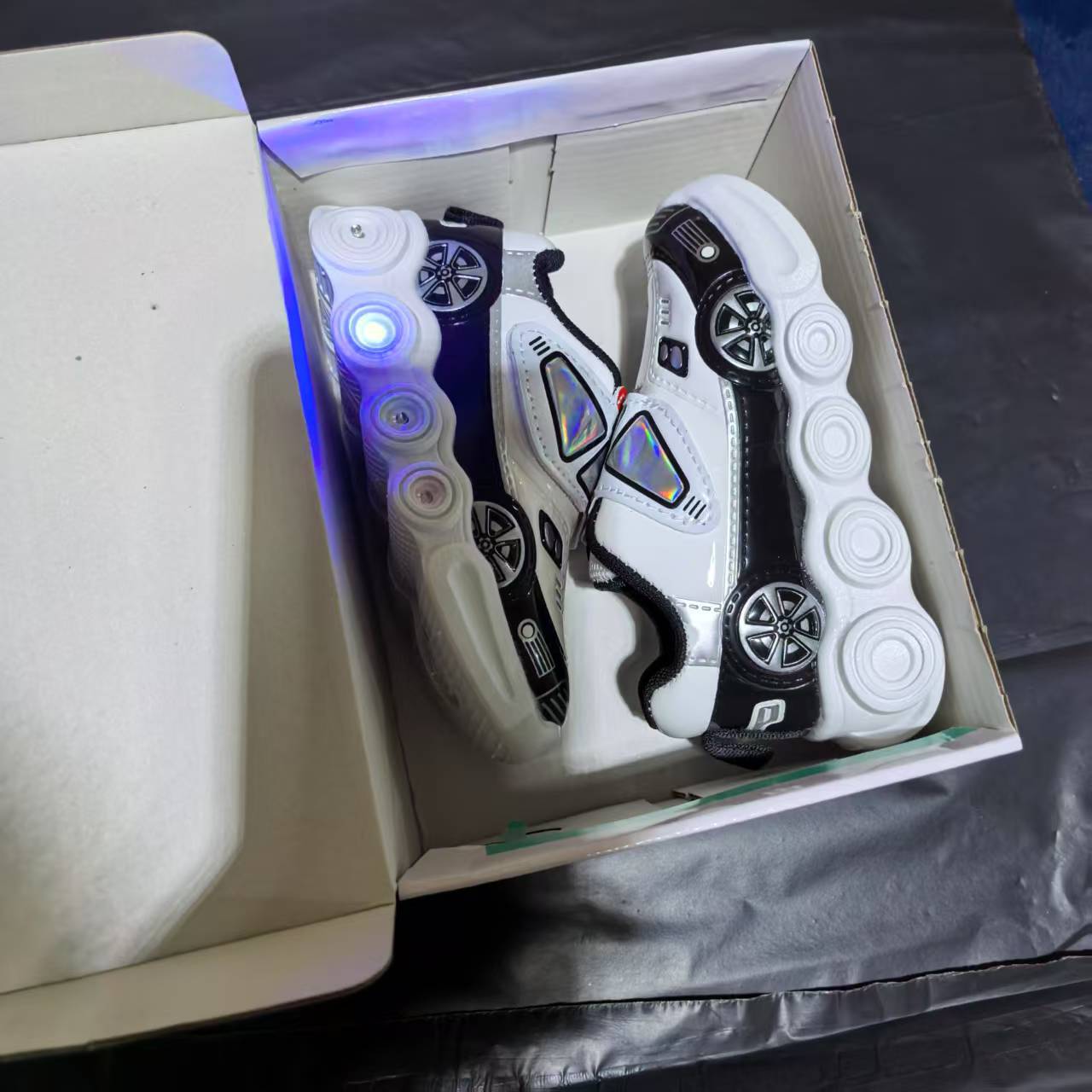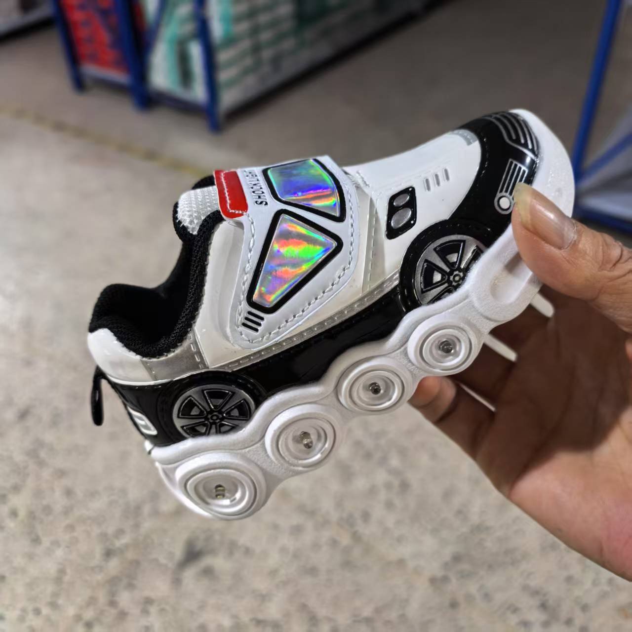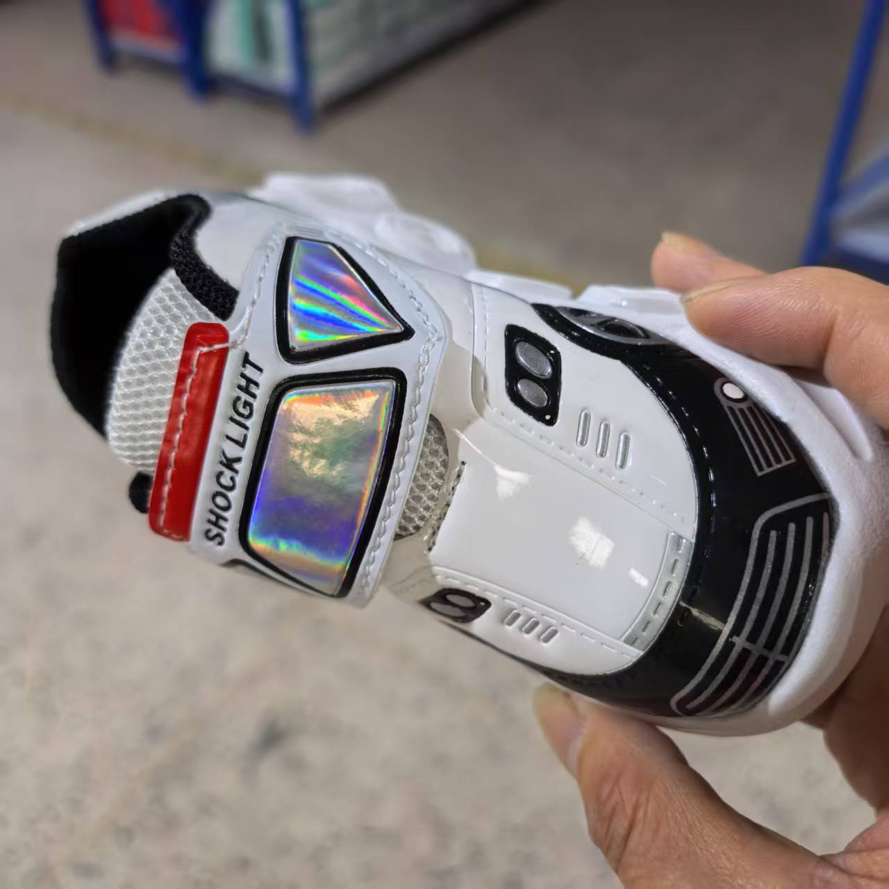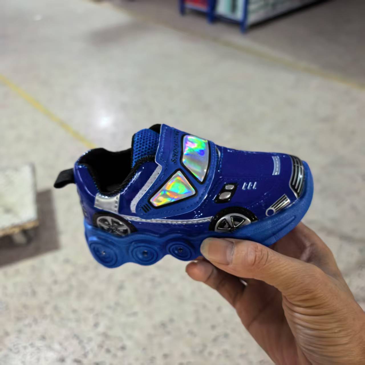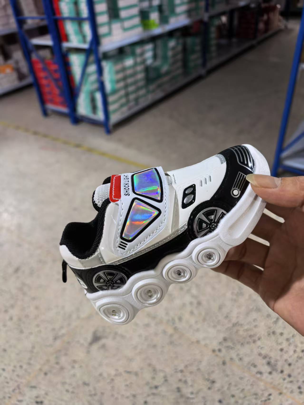 此款是镜面材料,皮面是发亮的,鞋底是环保材料,灯是大电池还有感应的
