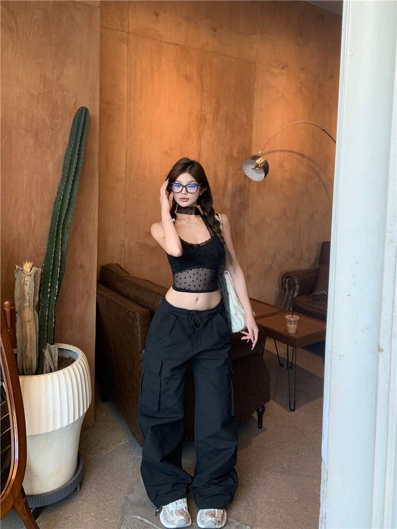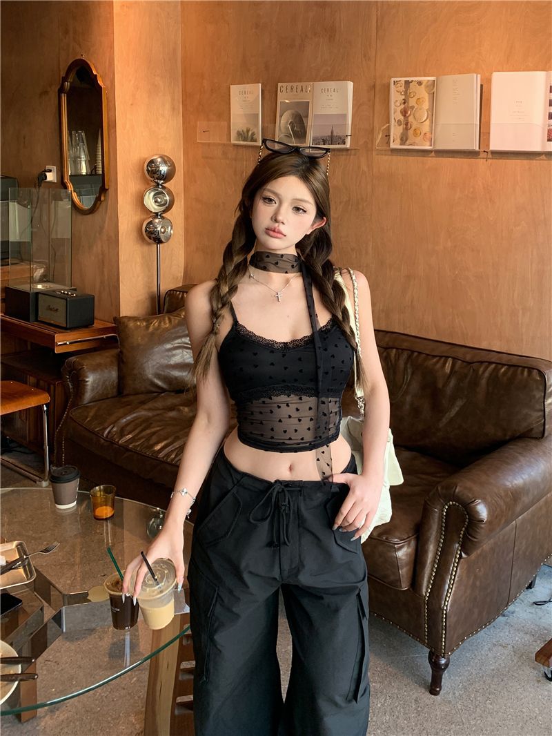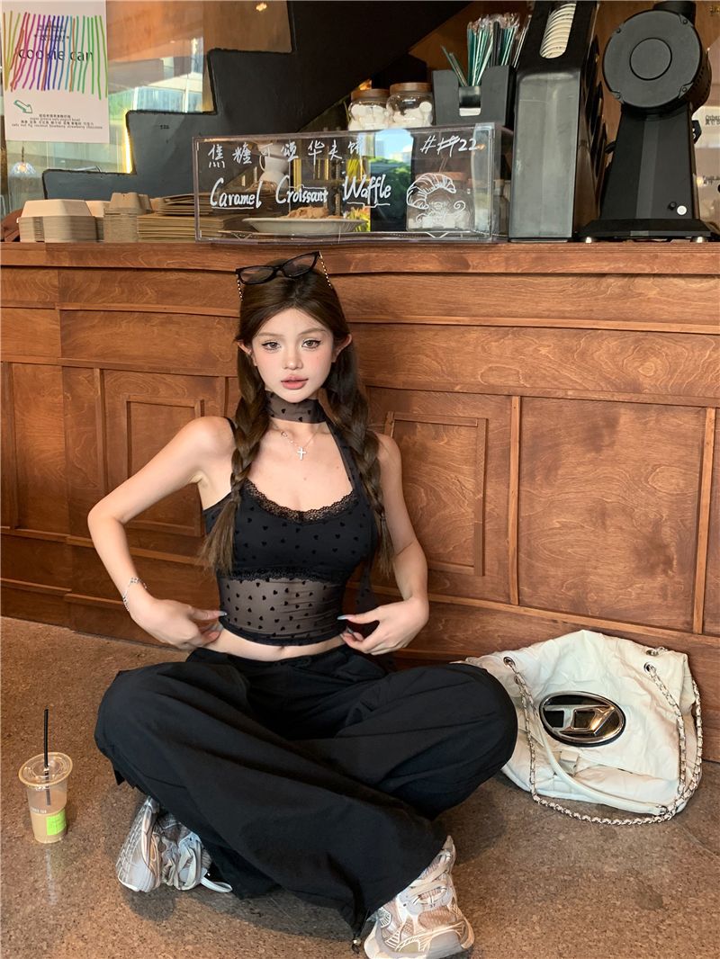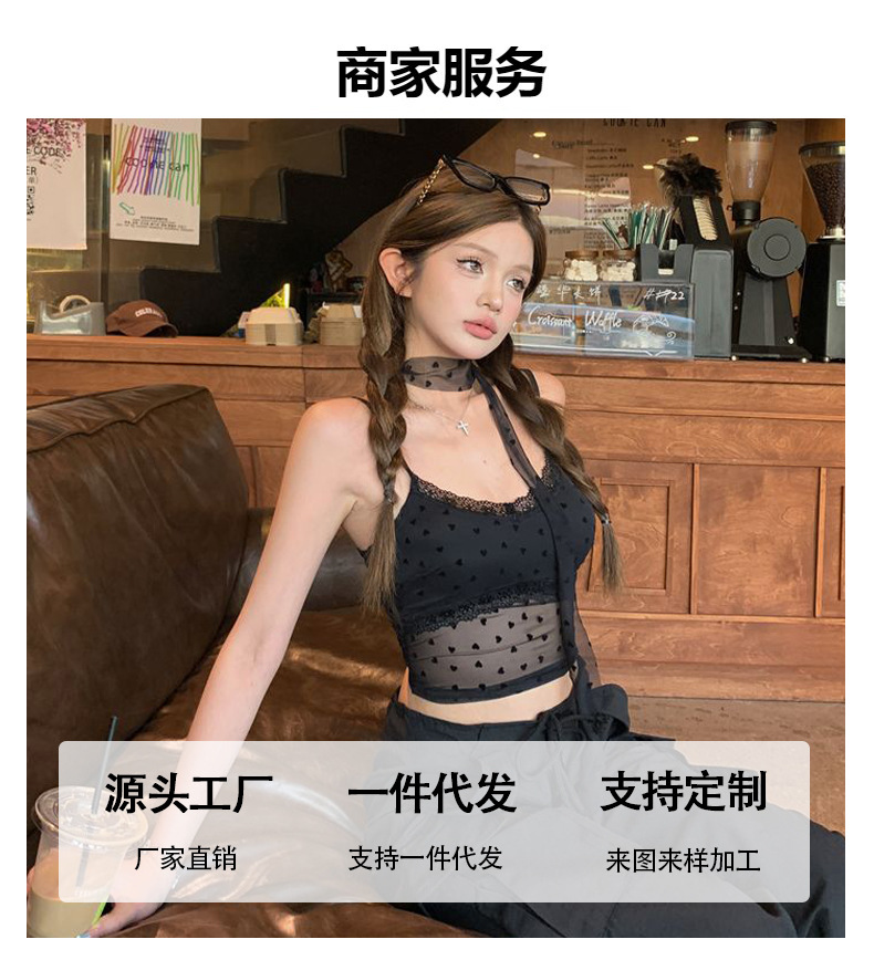 아메리칸 핫걸 민소매 조끼 서스펜더 여성 여름 2025 새로운 슬림 짧은 섹시한 메쉬 시스루 아름다운 탑스토어 가기