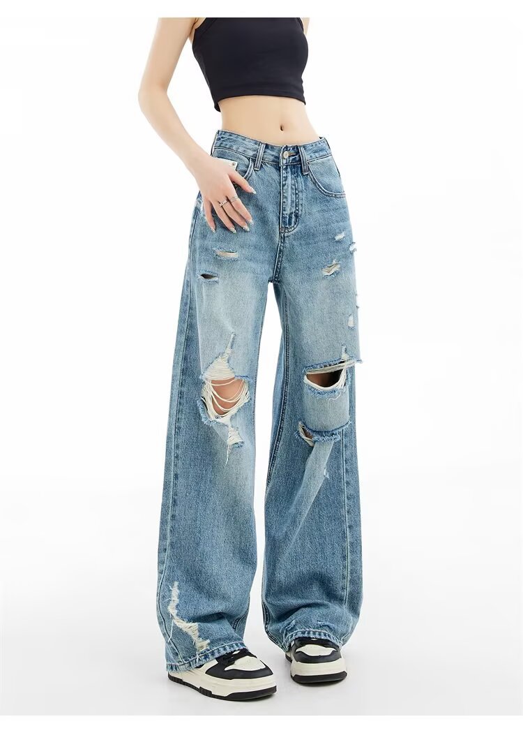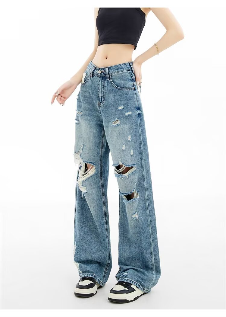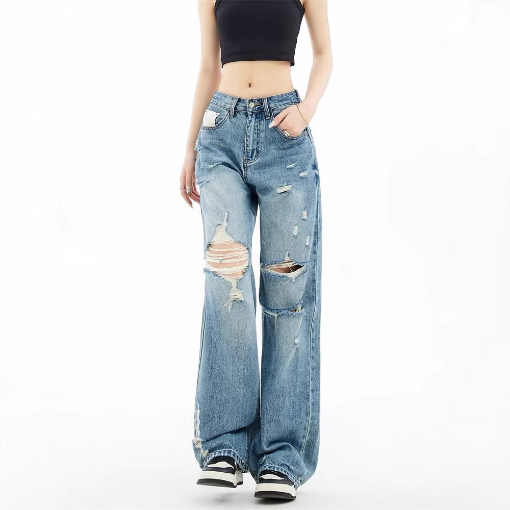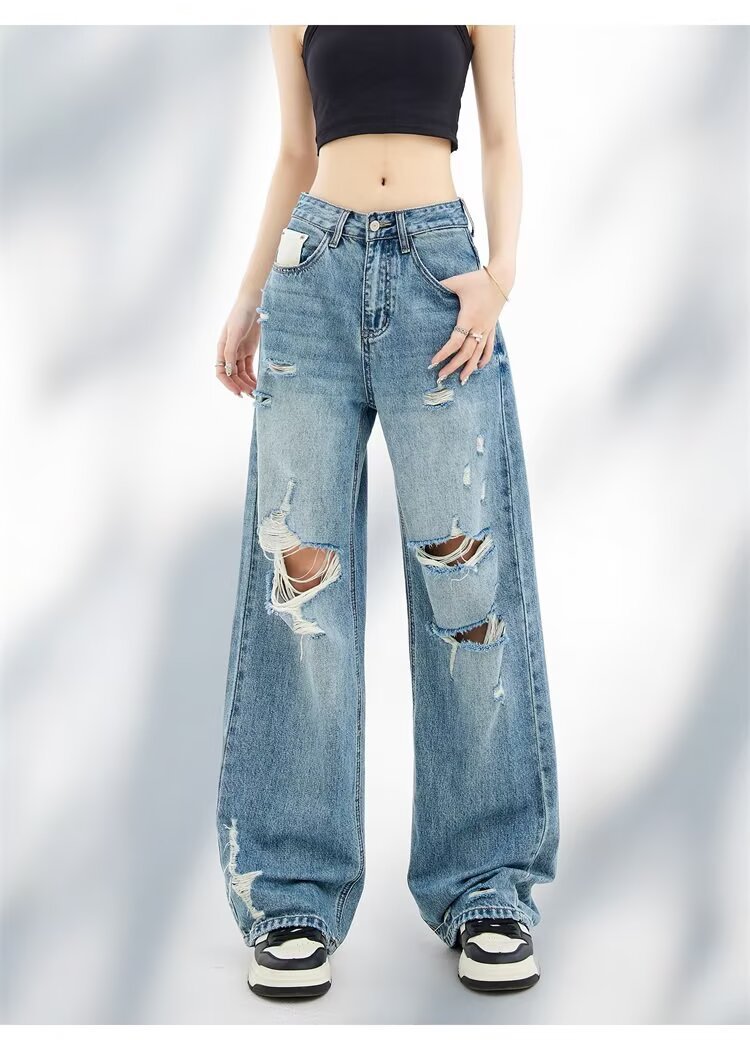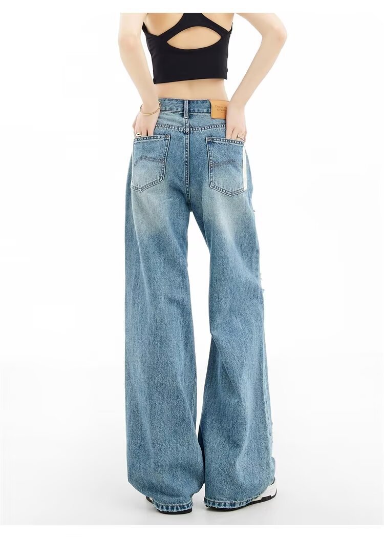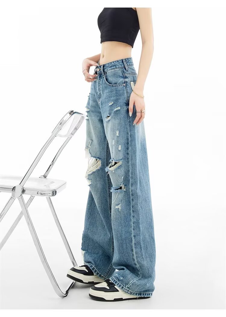 여름용 여성용 아메리칸 하이 스트리트 클린핏 워싱 찢어진 청바지 얇은 복고풍 바이브 와이드 레그 롱 팬츠스토어 가기