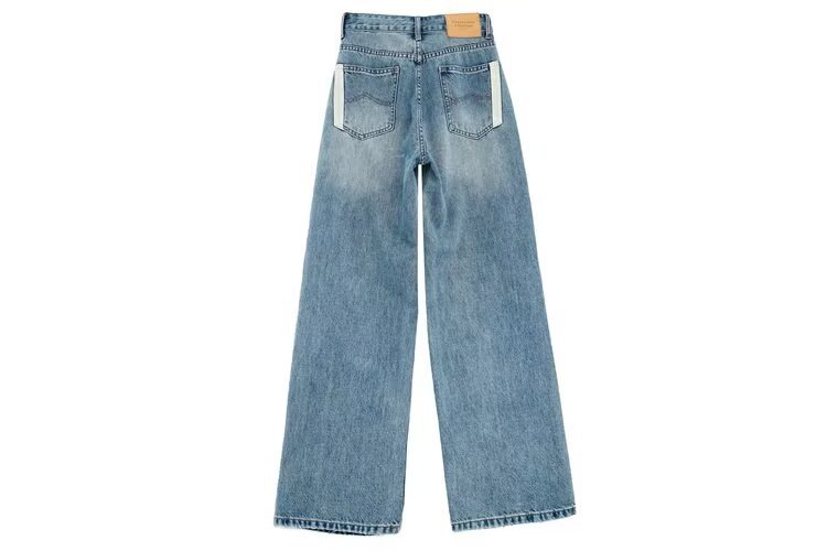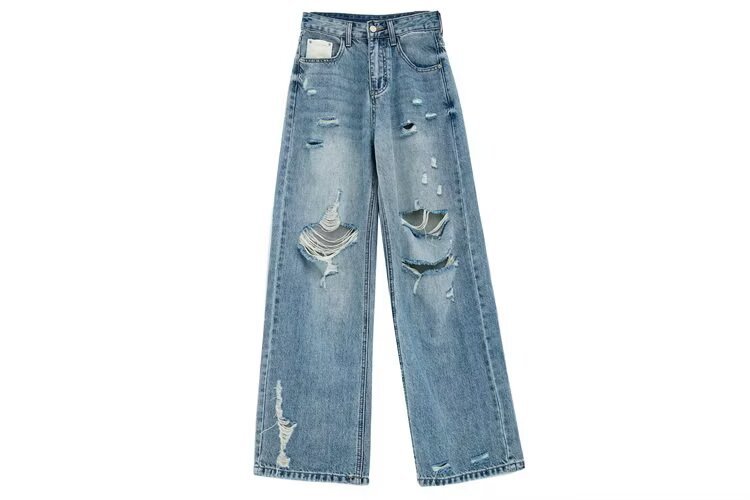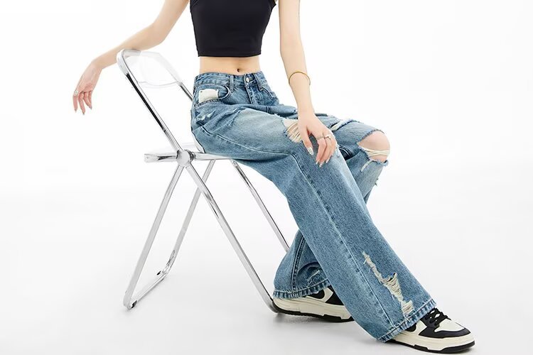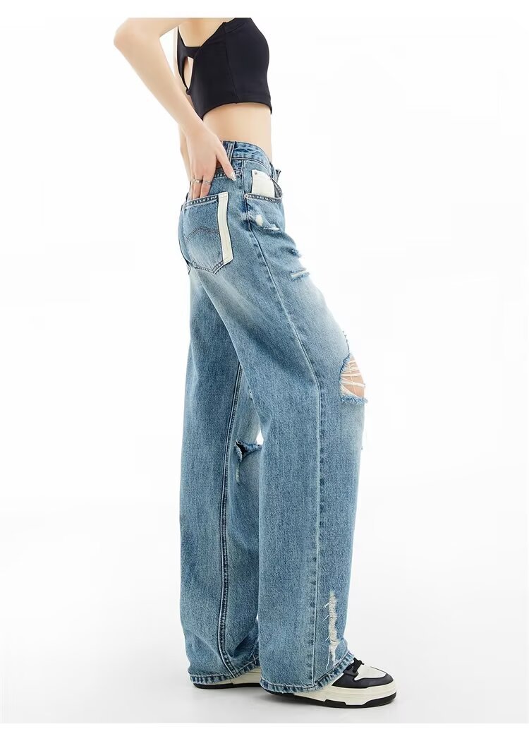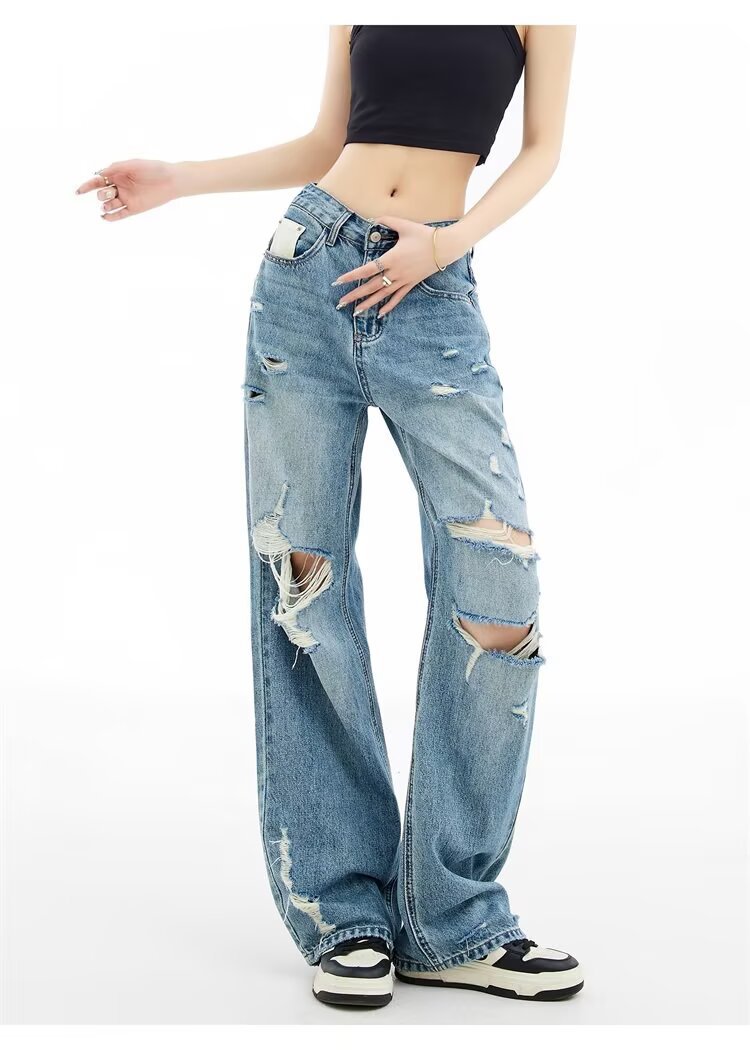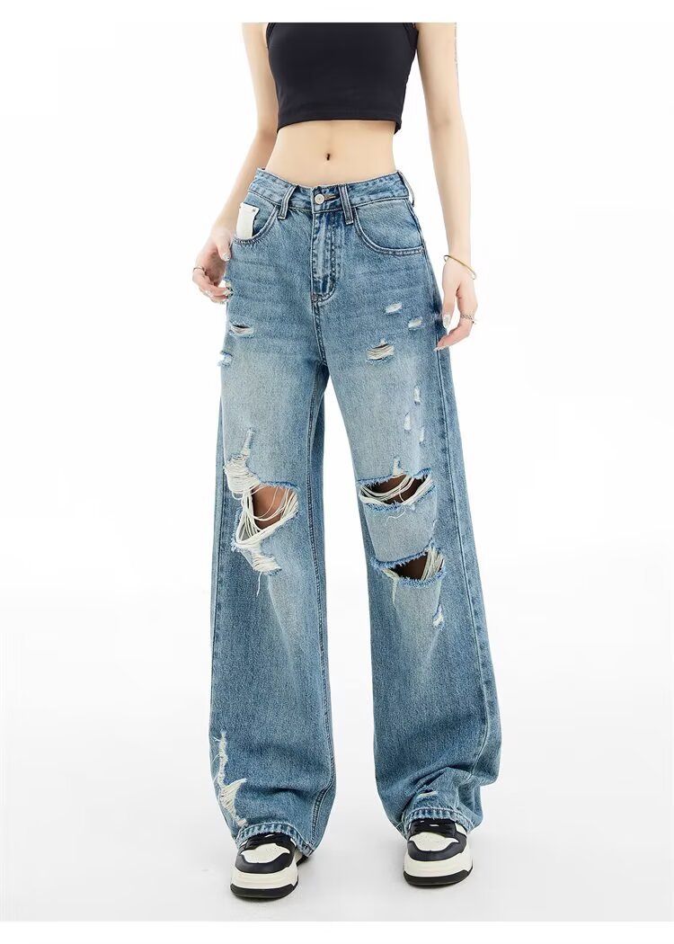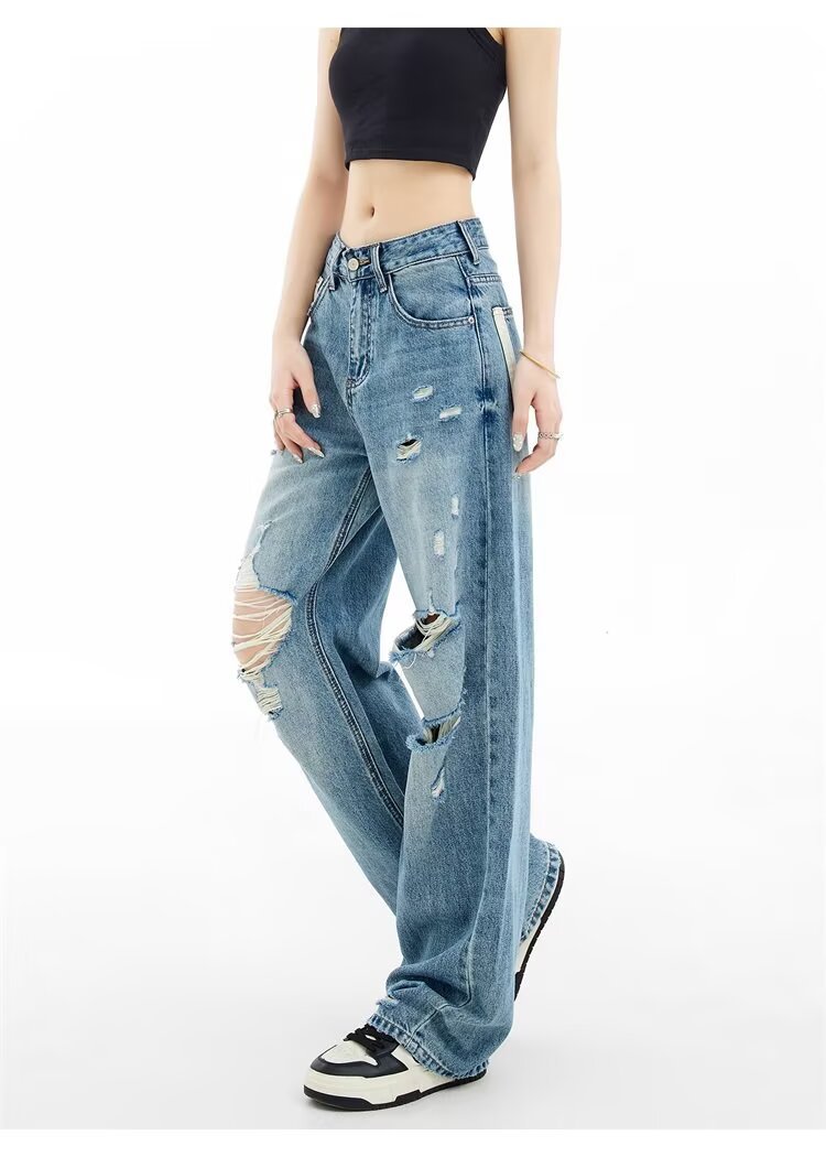 여름용 여성용 아메리칸 하이 스트리트 클린핏 워싱 찢어진 청바지 얇은 복고풍 바이브 와이드 레그 롱 팬츠스토어 가기