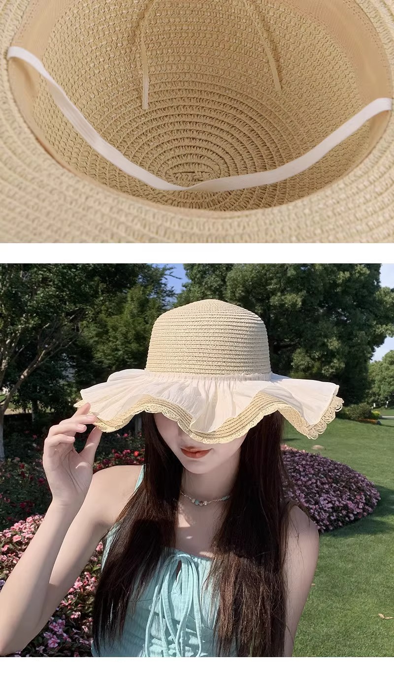 여성을위한 튤립 레이스 밀짚 모자 여름 해변 휴가 스타일 태양 보호 모자 큰 챙 태양 모자
