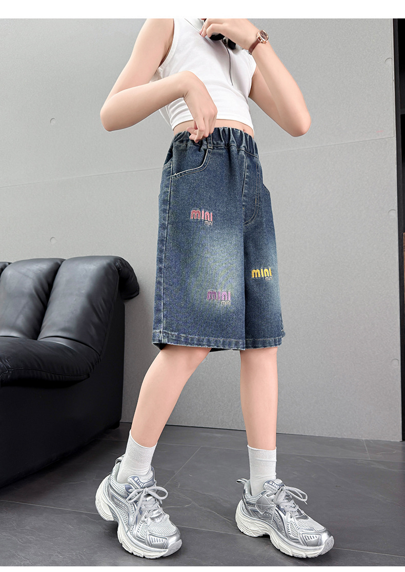 여아 한국 스타일 데님 반바지 여름 2025 새로운 스타일 중대형 아동 여름 의류 문자 자수 루즈 데님 반바지 유행