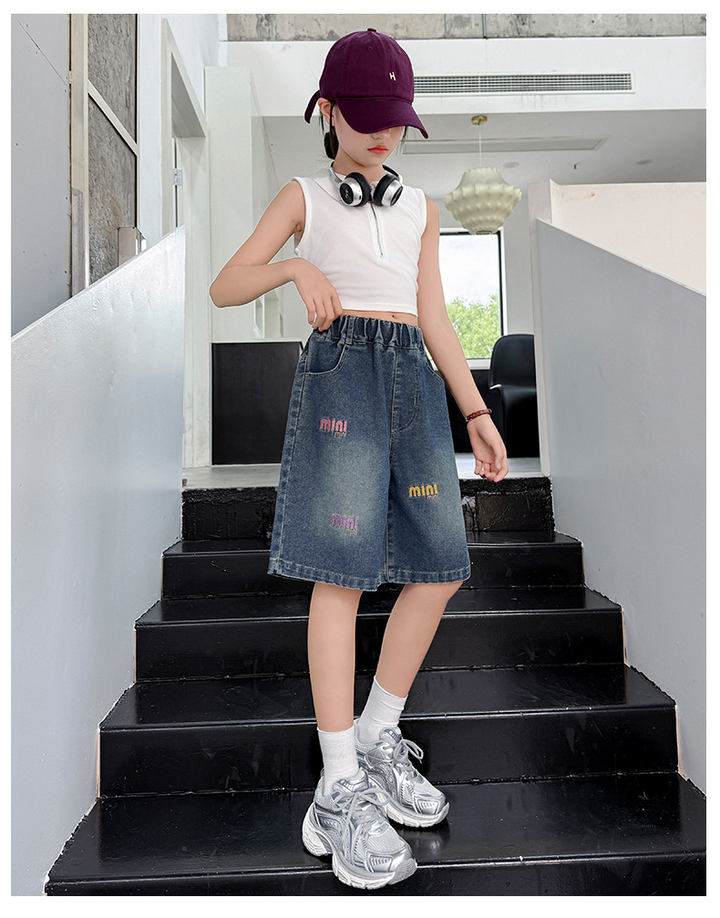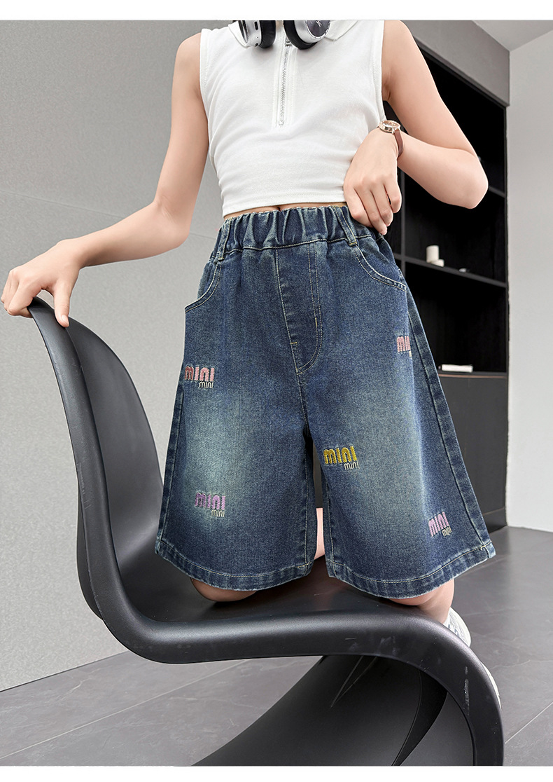 여아 한국 스타일 데님 반바지 여름 2025 새로운 스타일 중대형 아동 여름 의류 문자 자수 루즈 데님 반바지 유행스토어 가기
