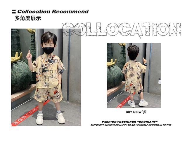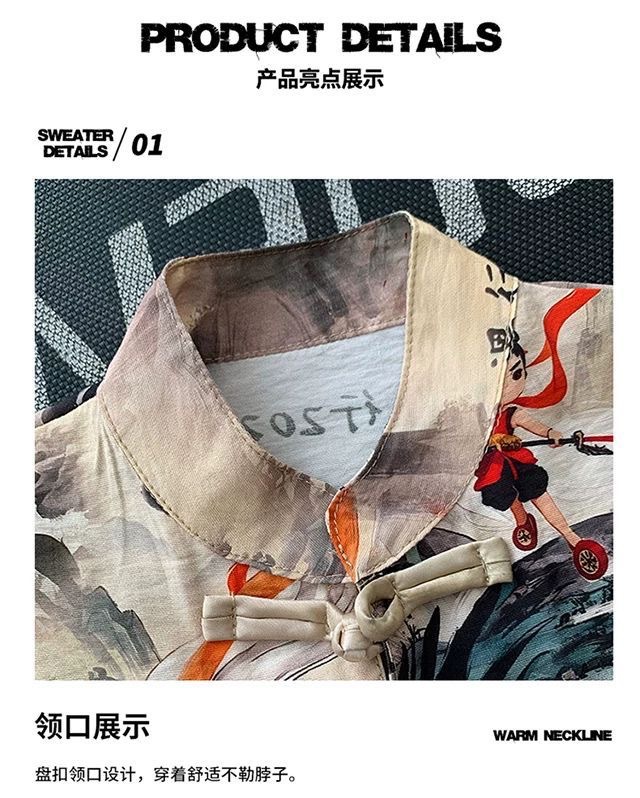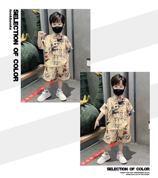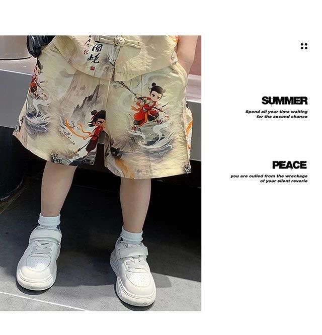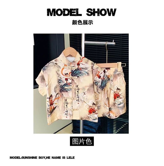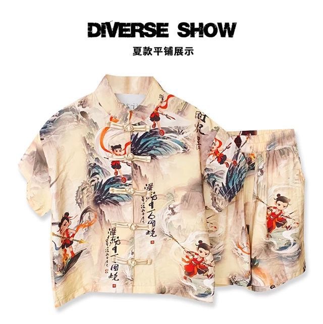 Nezha Clothes 2025 새로운 여름 어린이 정장 소년 Hanfu 여름 정장 중국 셔츠 반바지 투피스 세트스토어 가기