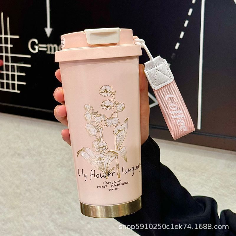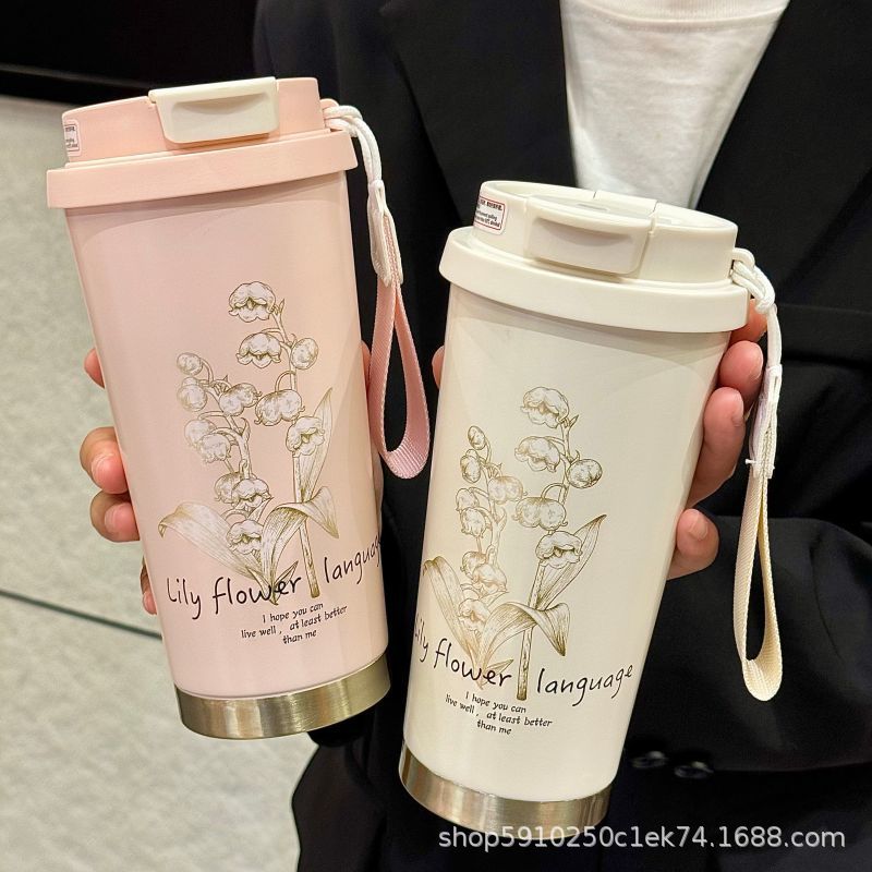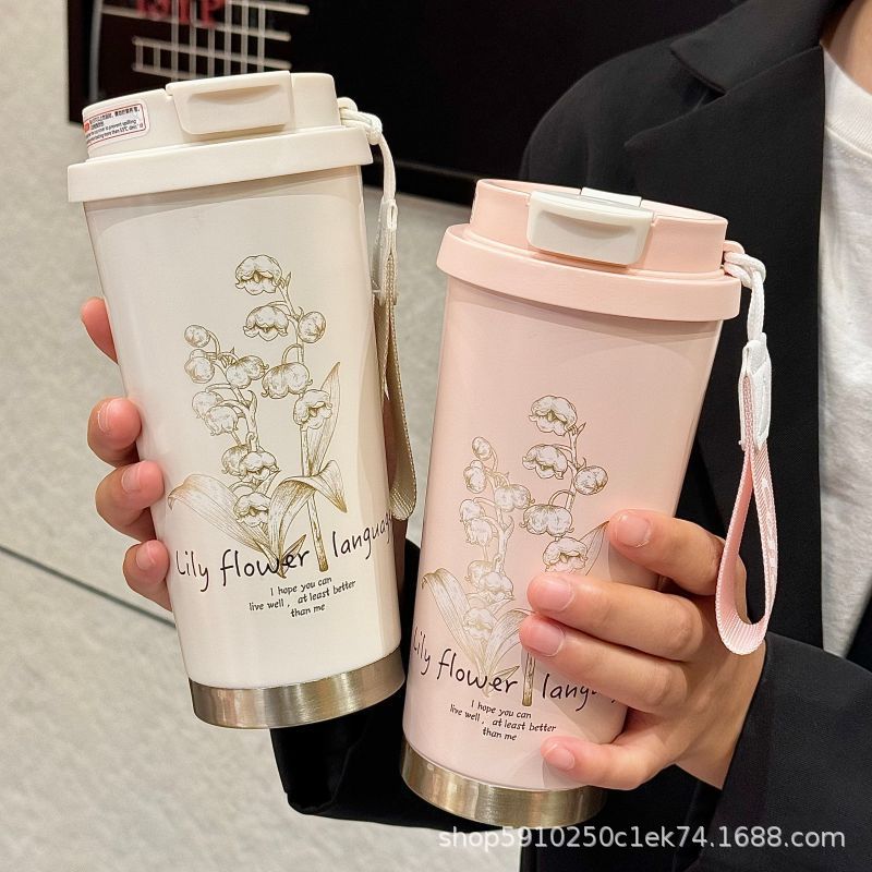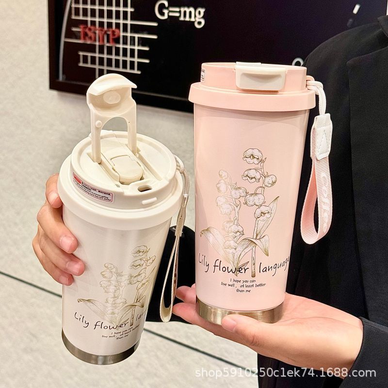 새로운 은방울꽃 보온병 컵 316 스테인레스 스틸 커피 컵 소녀 대용량 고가치 밀짚 워터 컵스토어 가기