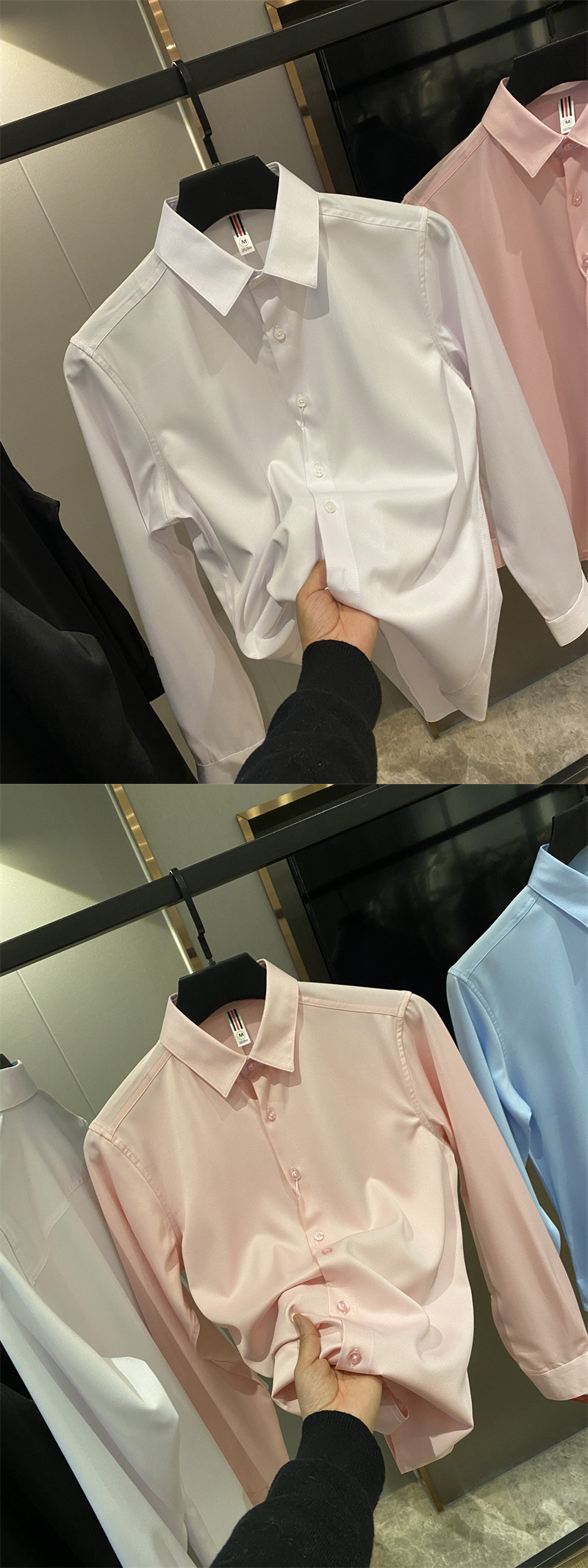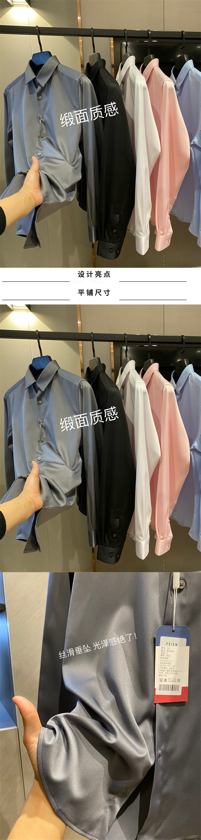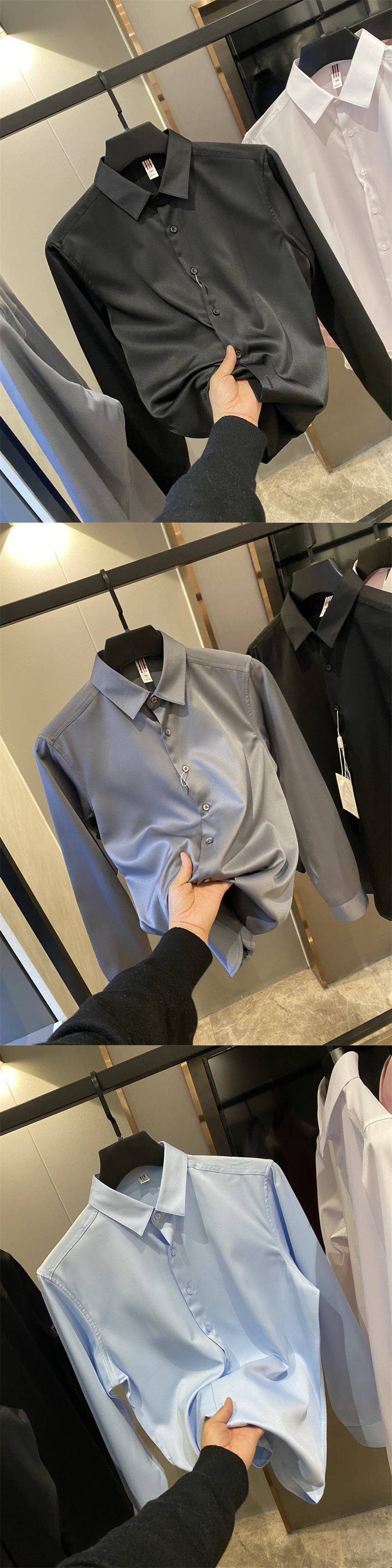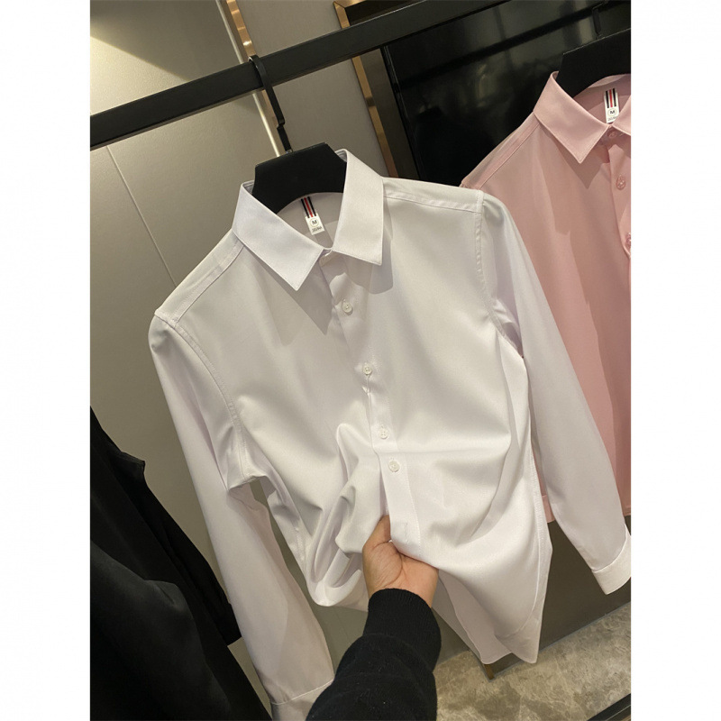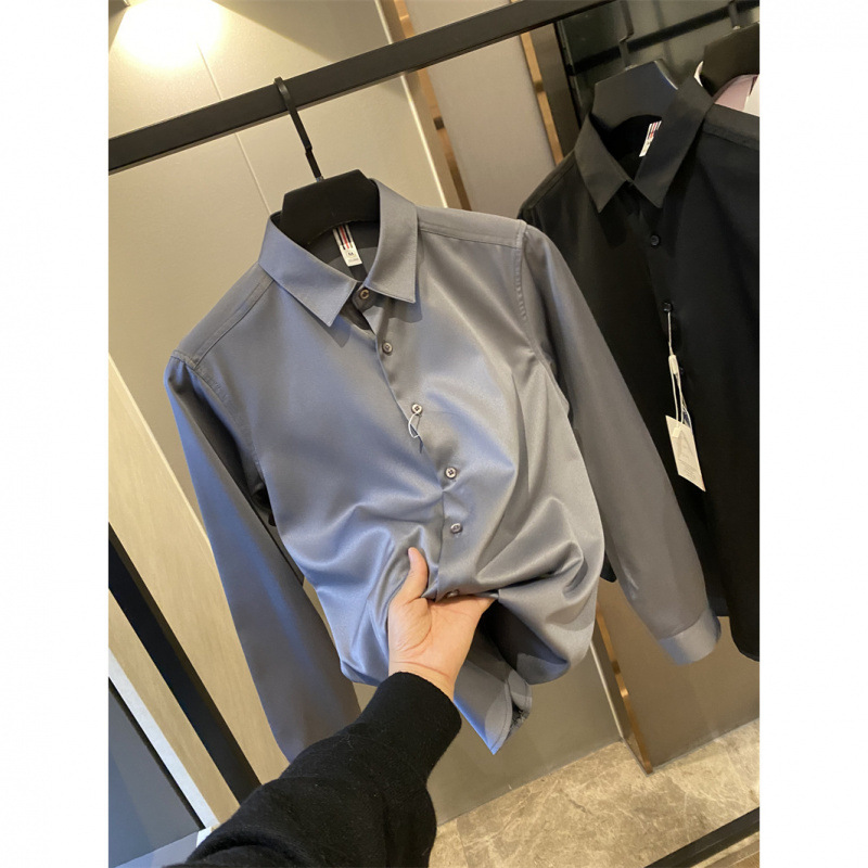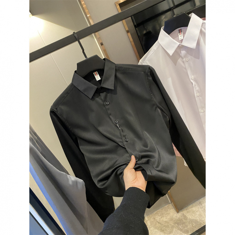 얇은 짧은 셔츠 트렌디 실키 드레이프 2025 봄 여름 새로운 솔리드 컬러 캐주얼 긴팔 셔츠 남성용스토어 가기