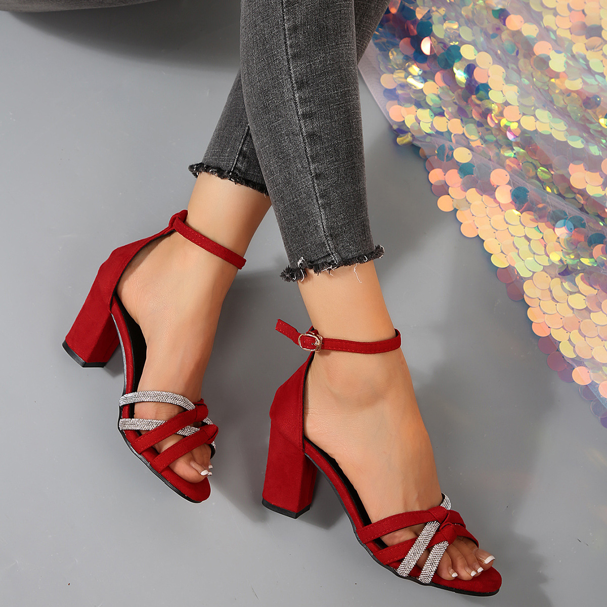 국경 간 대외 무역 여성 신발 2025 여름 새로운 두꺼운 굽 하이힐 샌들 밝은 다이아몬드 프렌치 스트랩 하이힐 샌들스토어 가기