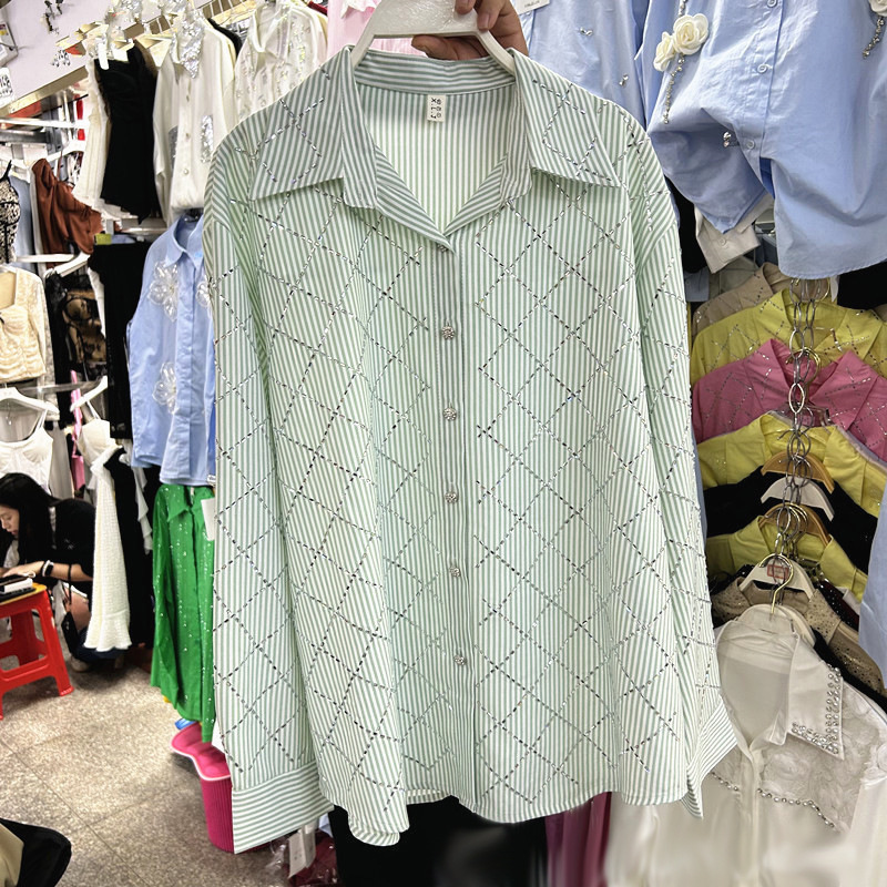 2025 새로운 여름 여성 프랑스 스타일 우아한 핫 다이아몬드 마름모 캐주얼 느슨한 얇은 긴팔 옷깃 셔츠