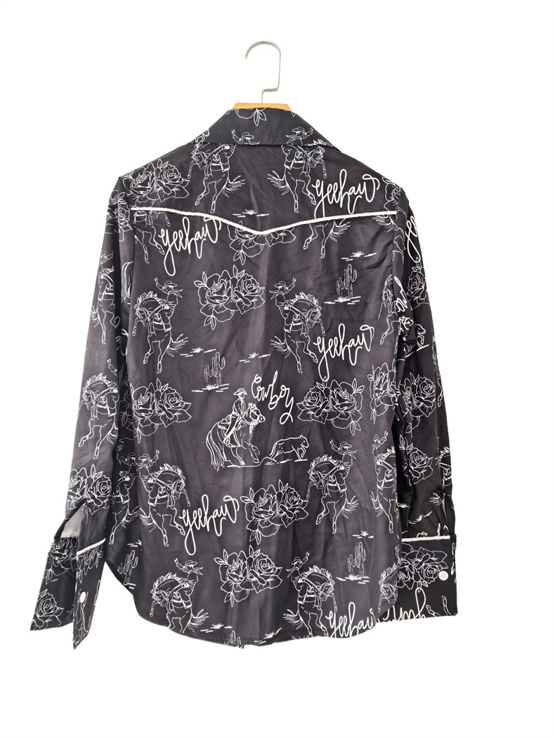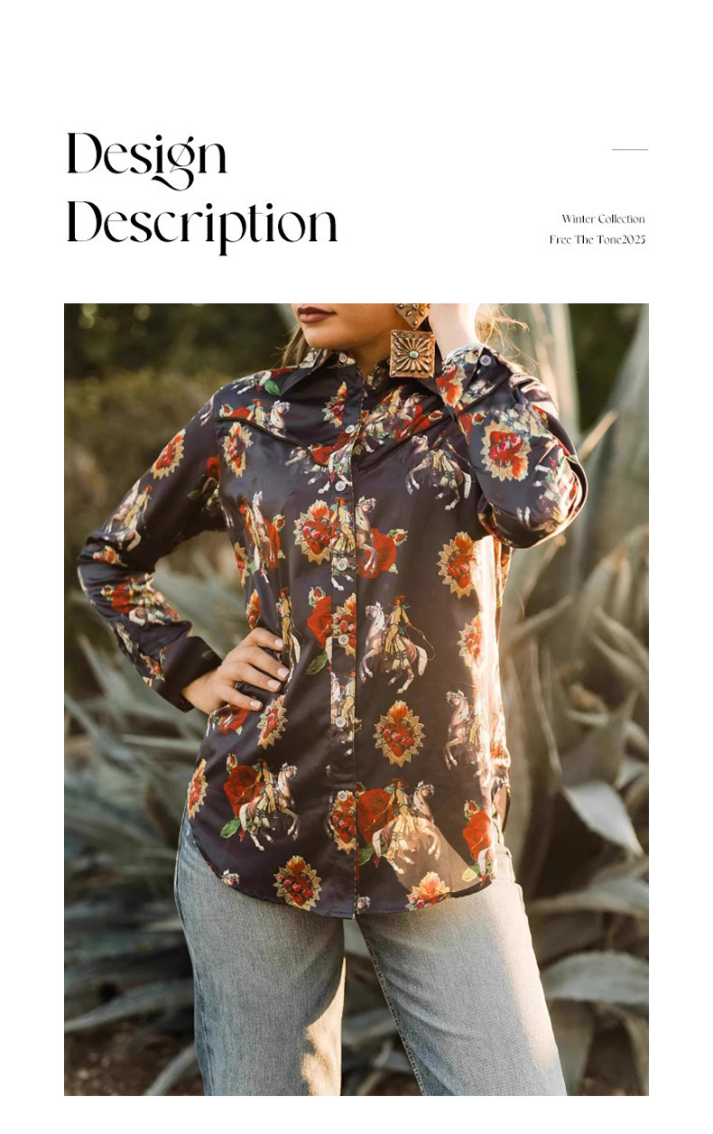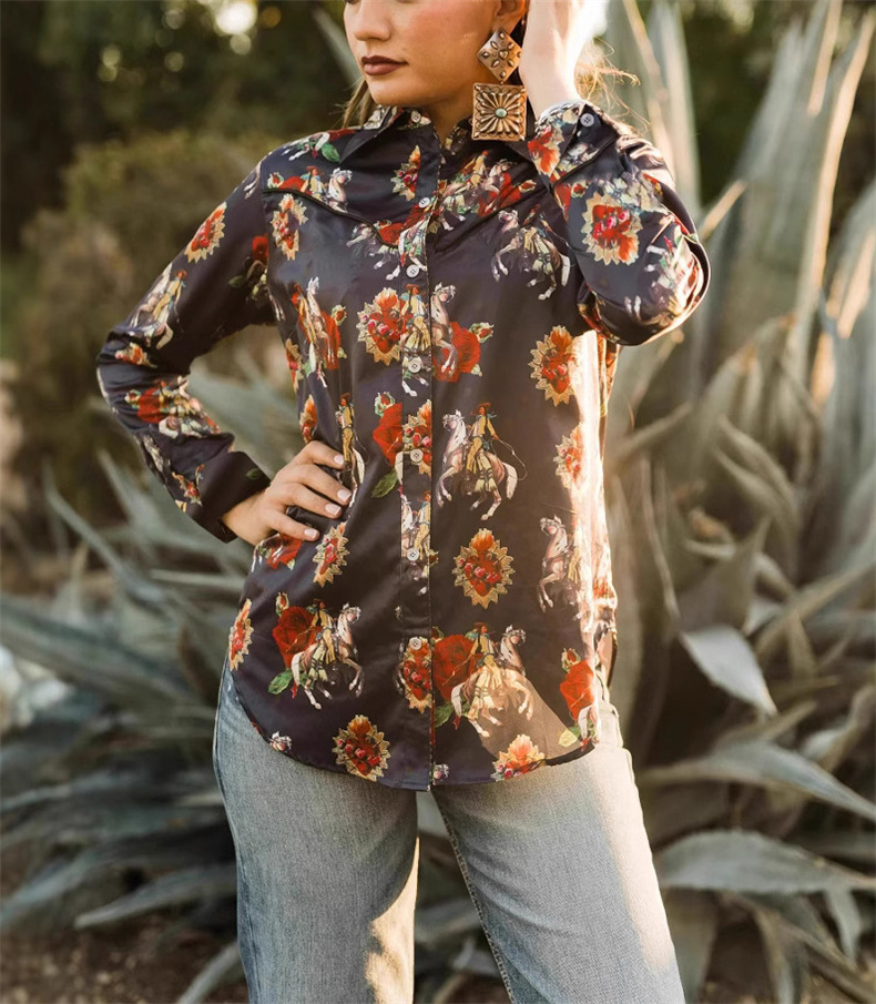 2025 새로운 국경 간 대외 무역 긴팔 라펠 셔츠 웨스턴 데님 에스닉 스트리트 프린트 슬림 여성 셔츠