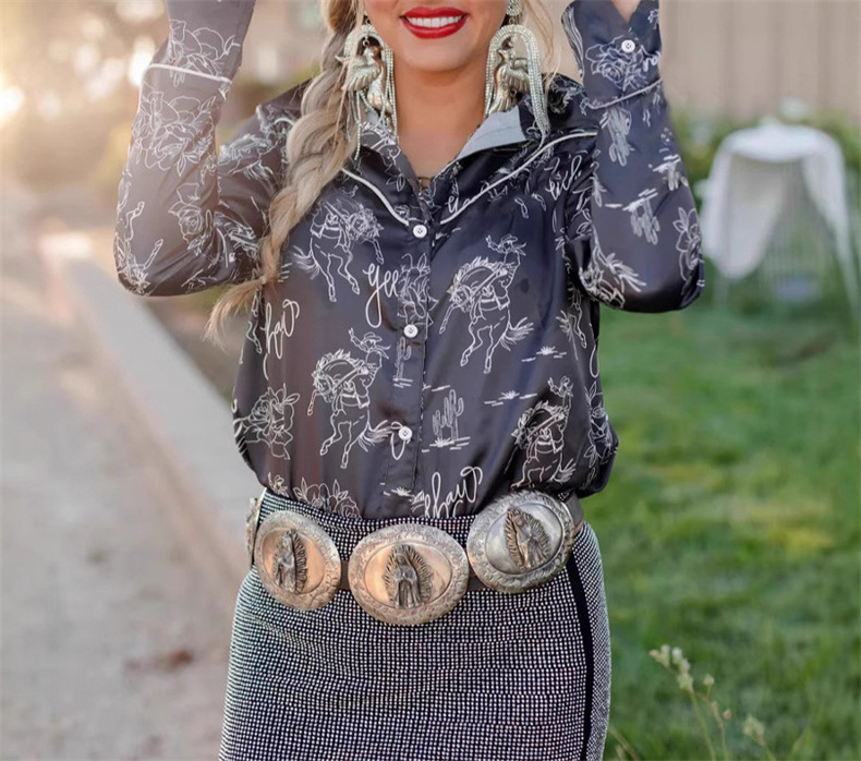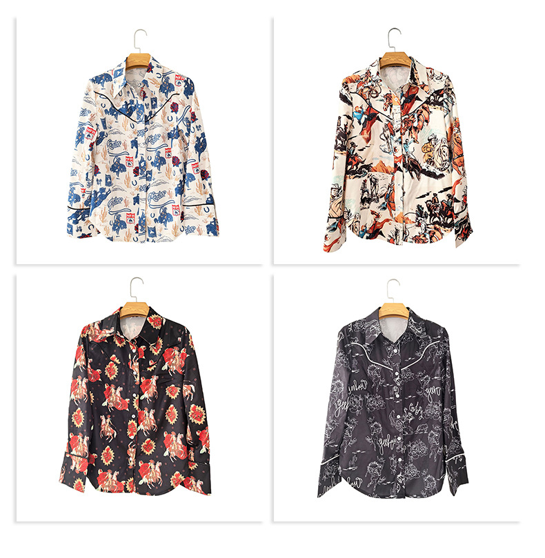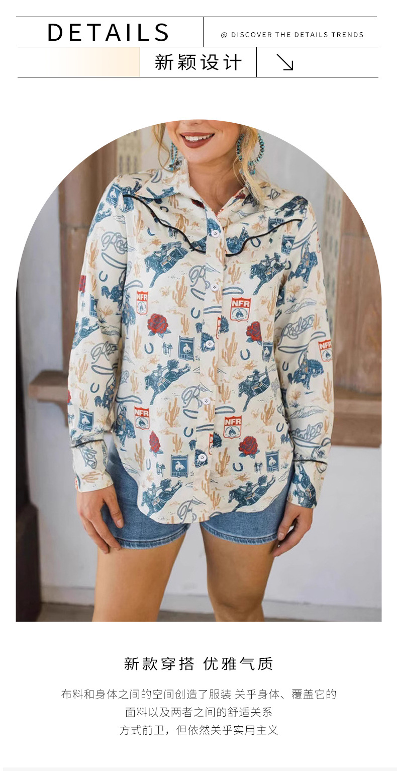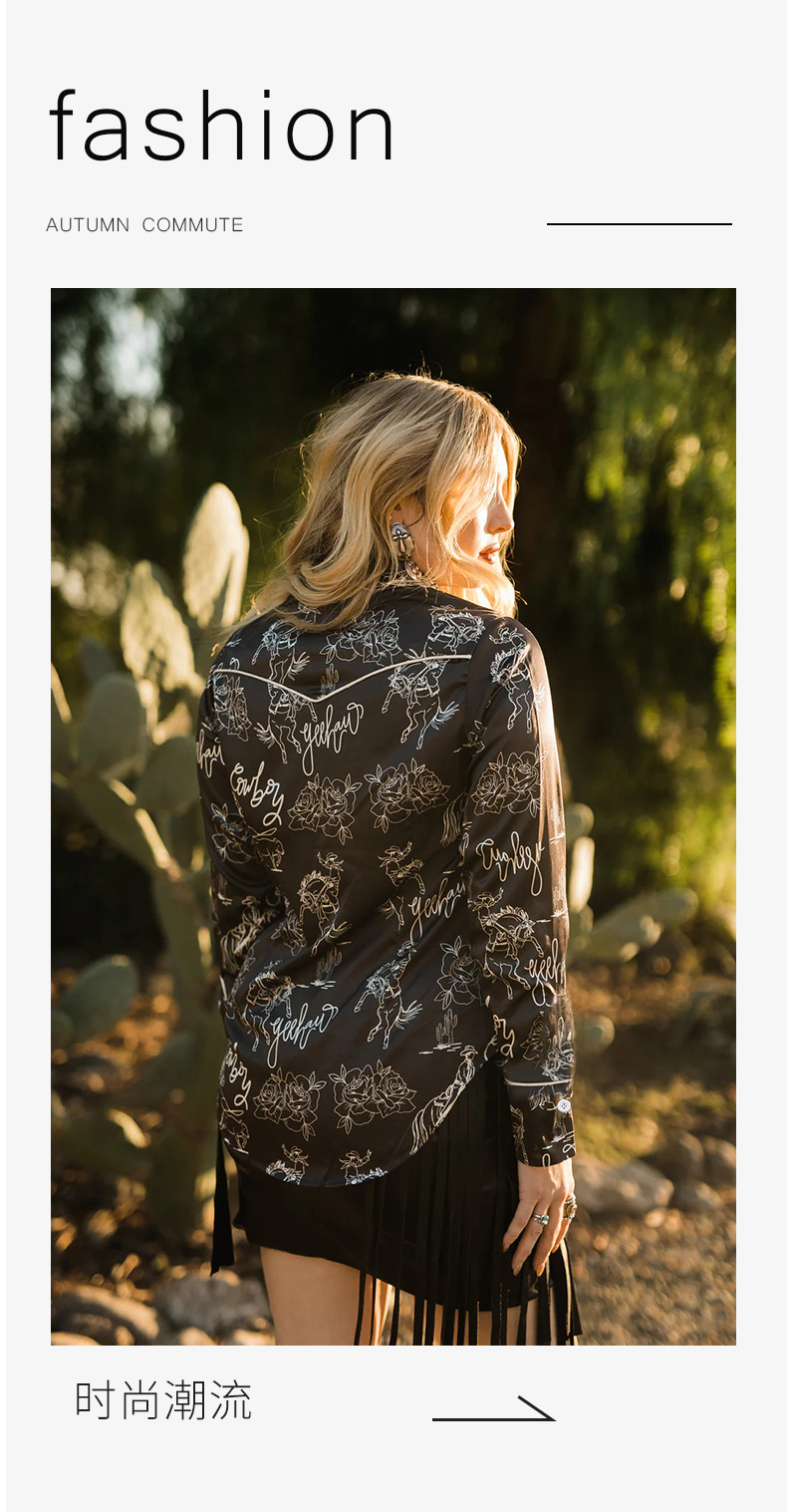 2025 새로운 국경 간 대외 무역 긴팔 라펠 셔츠 웨스턴 데님 에스닉 스트리트 프린트 슬림 여성 셔츠스토어 가기