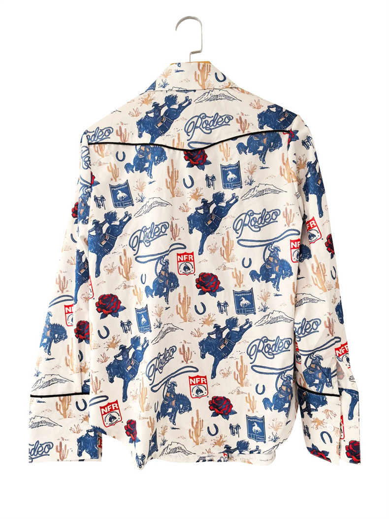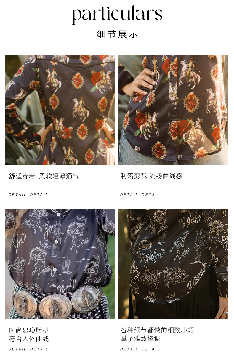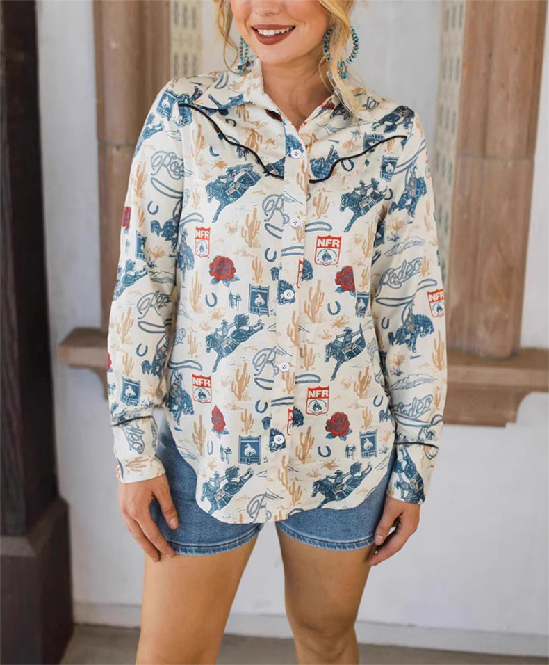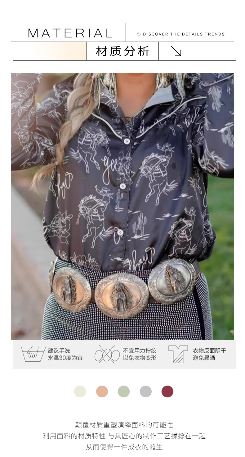 2025 새로운 국경 간 대외 무역 긴팔 라펠 셔츠 웨스턴 데님 에스닉 스트리트 프린트 슬림 여성 셔츠스토어 가기