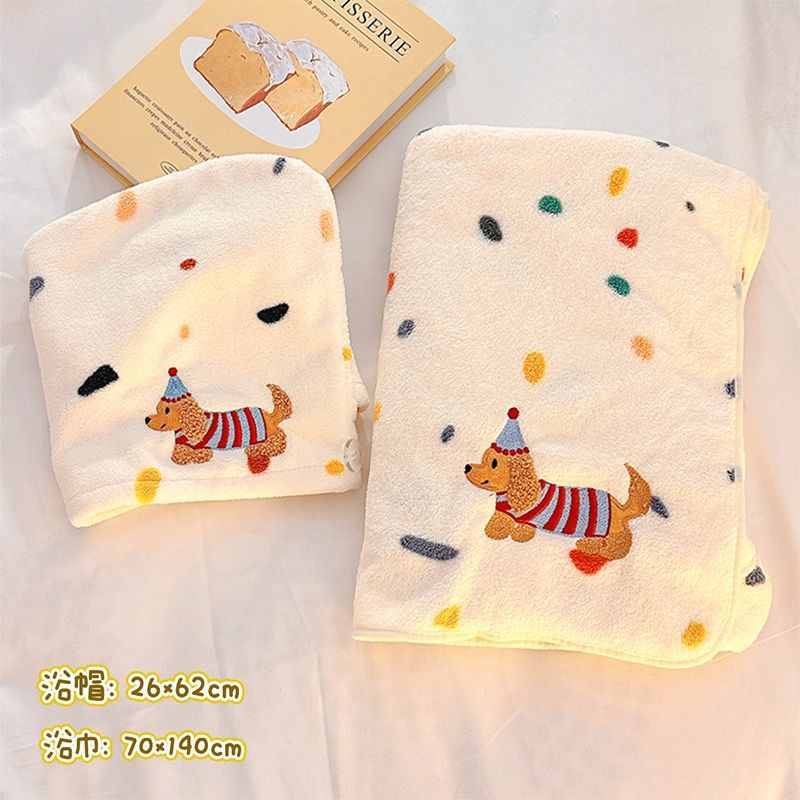 • 폴카 도트 닥스훈트 목욕 타올 + 헤어 드라이어 캡