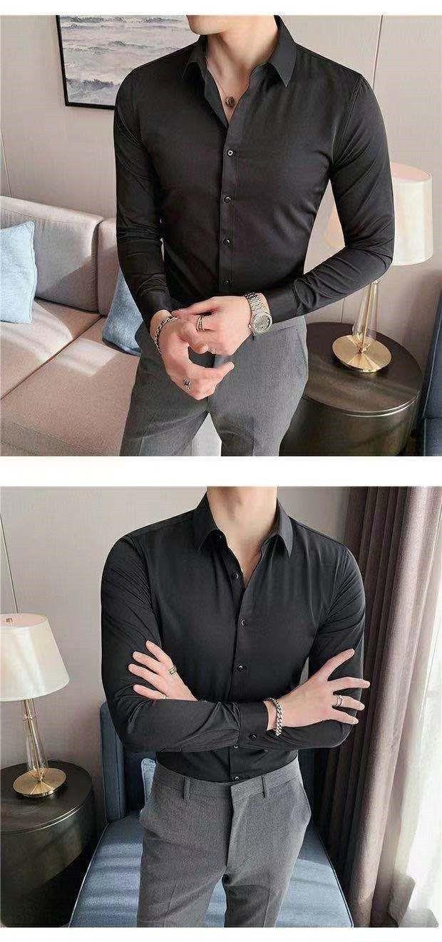 신축성 있는 긴팔 셔츠, 슬림핏, 얇은 블랙 셔츠, 비즈니스 캐주얼, 전문 정장 작업복, 남성용 작업 셔츠스토어 가기