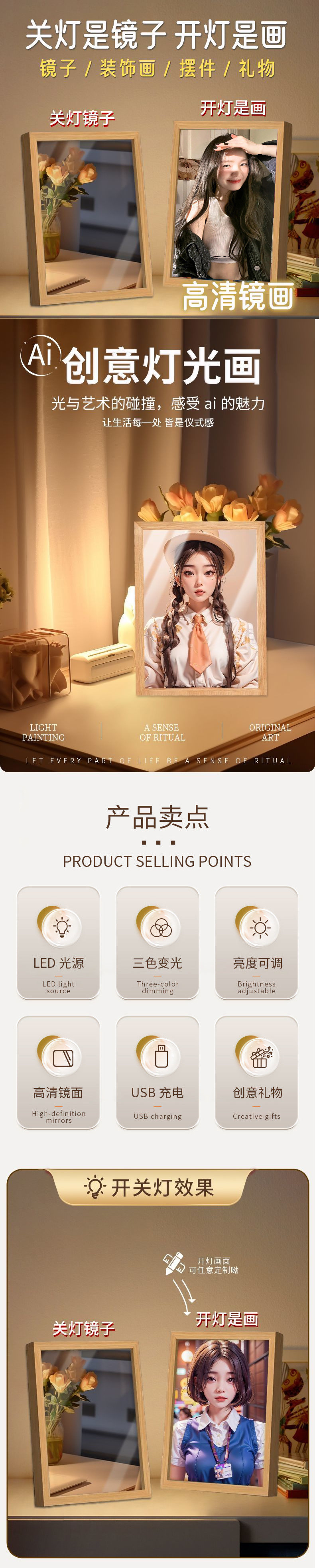 새로운 패션 거울 빛 그림 사진 diy 빛나는 그림 고급 야간 조명 침실 장식품 빛 그림 생일