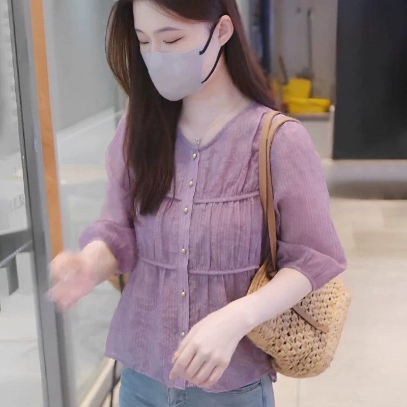 여성을위한 프렌치 라운드 넥 얇은 쉬폰 셔츠 여름 2025 새로운 핫 스타일 셔츠 독특하고 시크하며 아름다운 탑스토어 가기