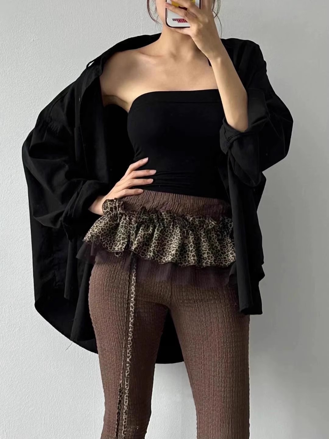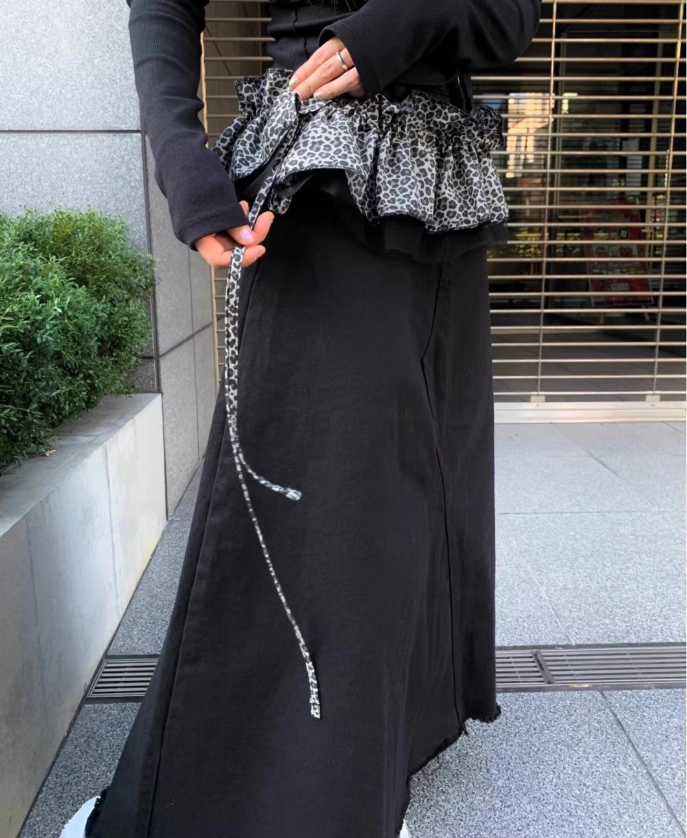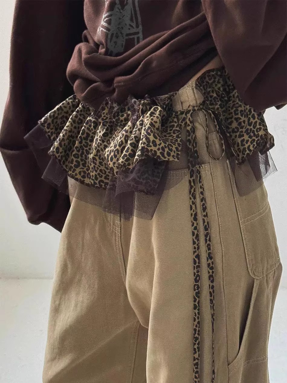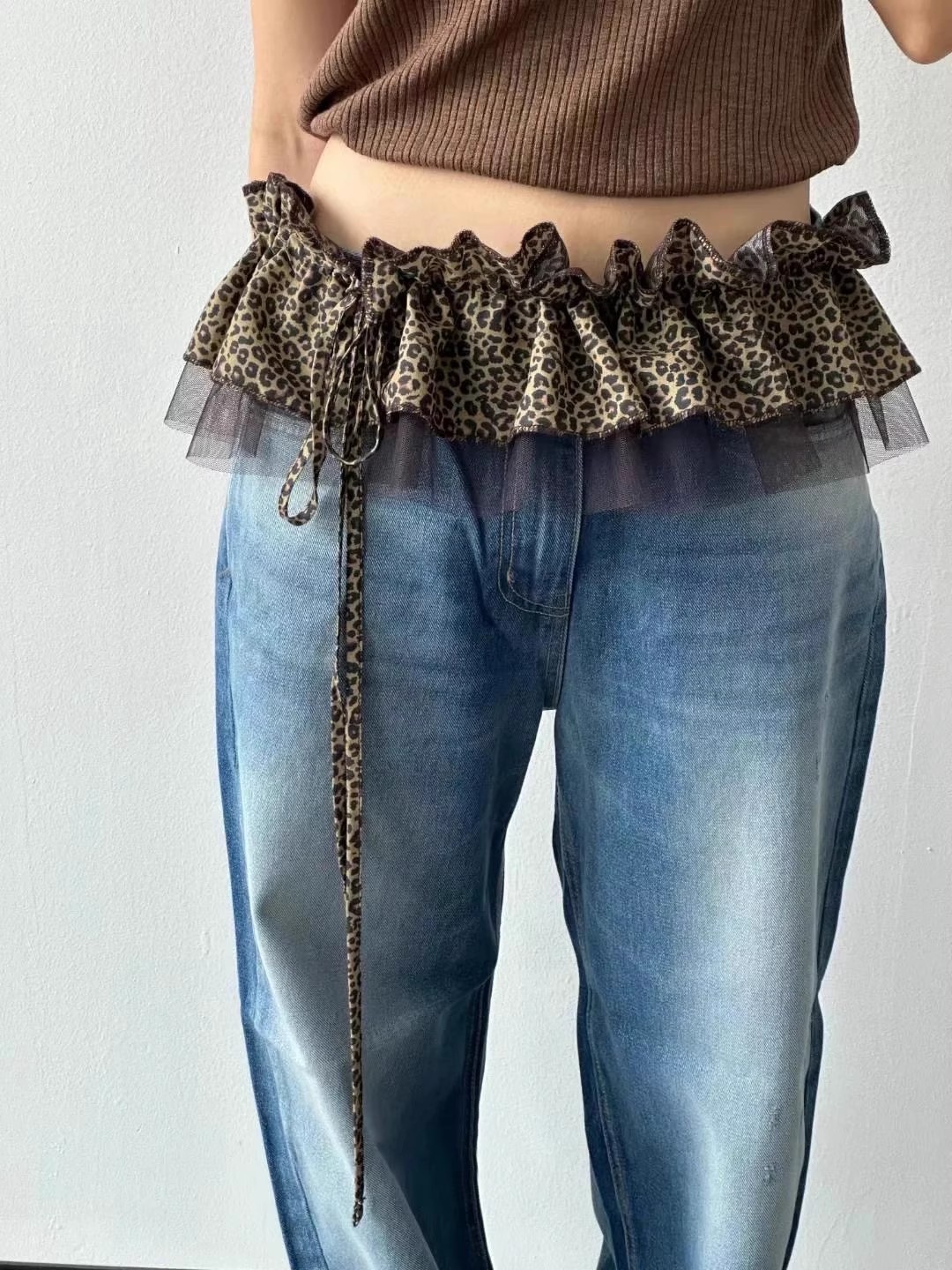 [제조사 직배송] 사계절 레오파드 프린트 앞치마, 레이어드 리본, 스마트 허리 장식, 짧은 스커트와 커튼