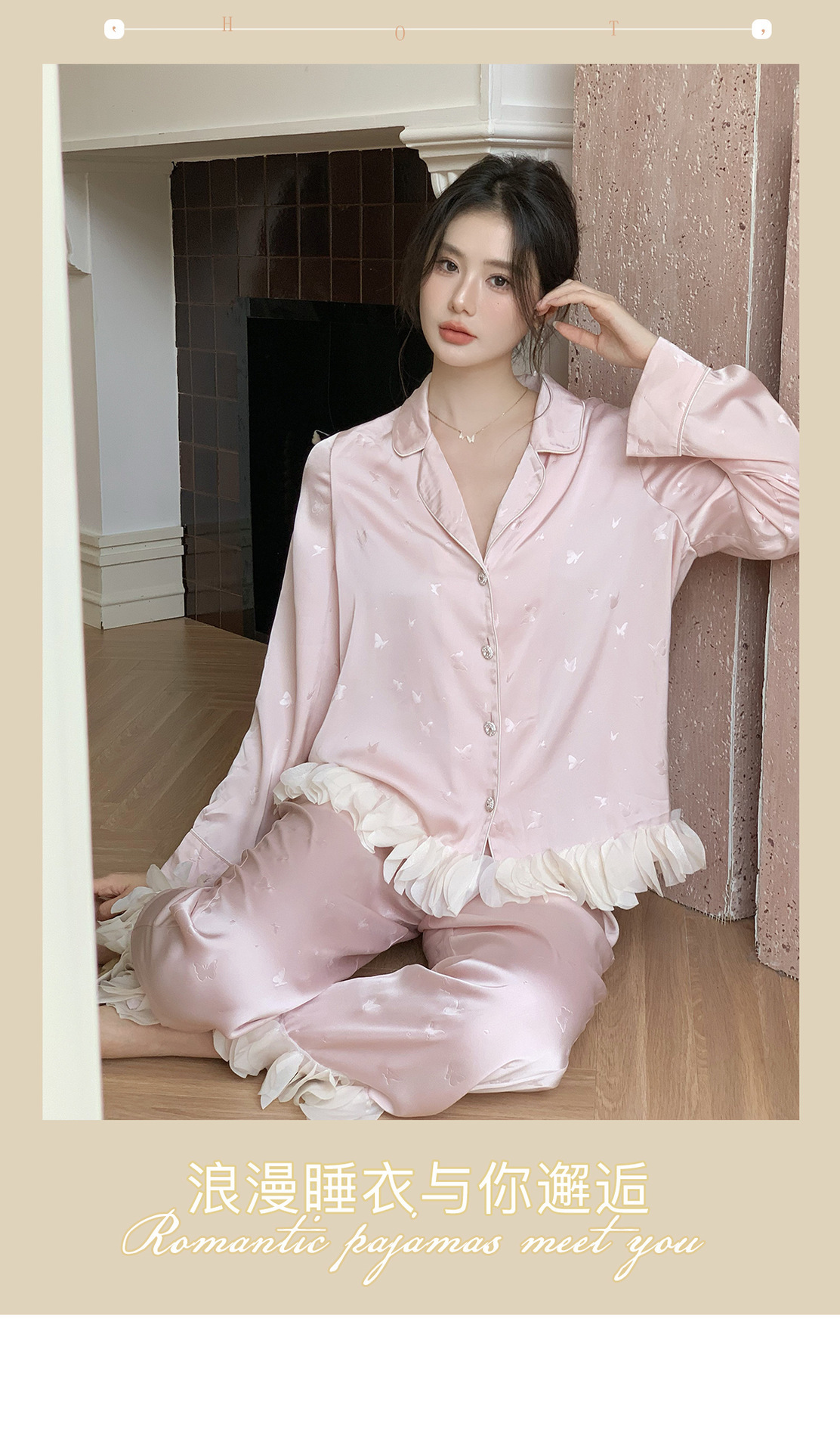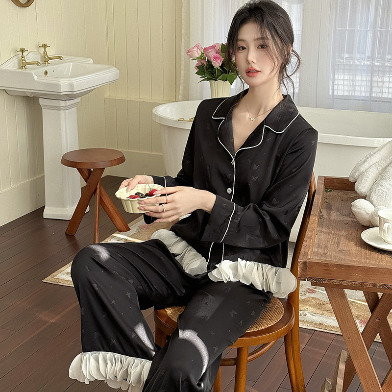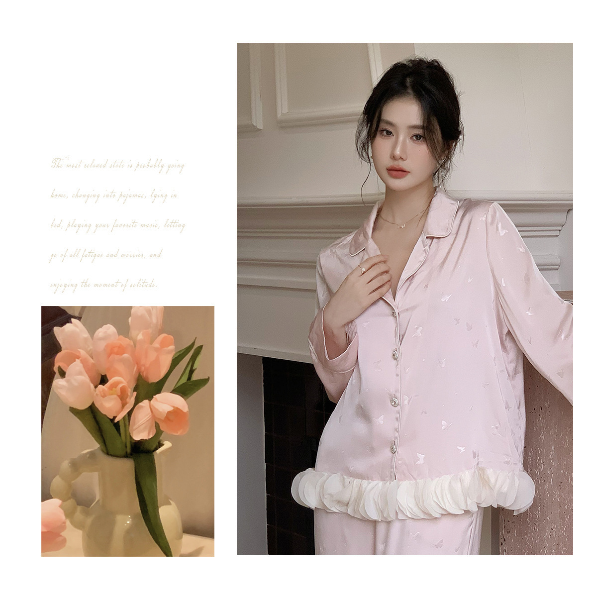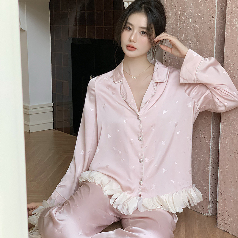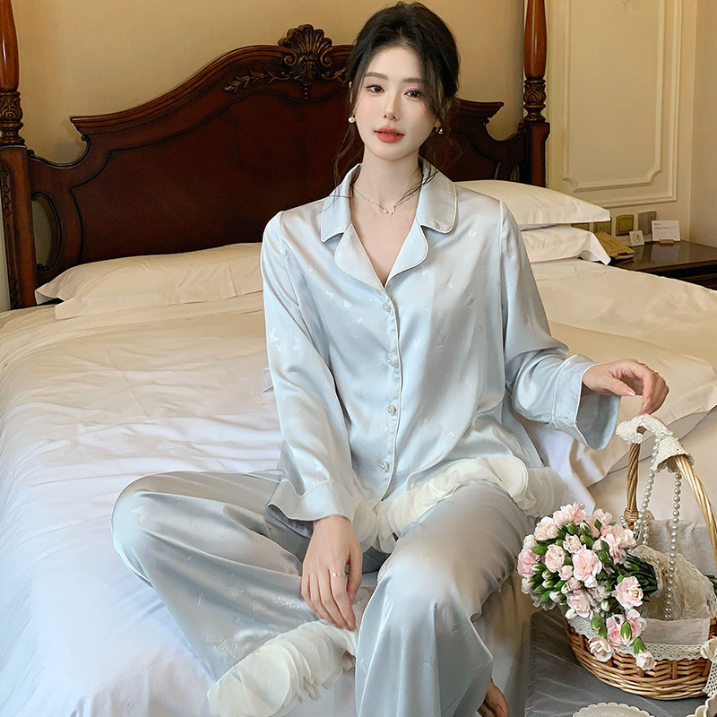 여성을위한 외부 착용 가능한 프랑스 스타일 새 잠옷 가을 얼음 실크 달콤한 공주 스타일 인쇄 긴팔 바지 정장 홈웨어