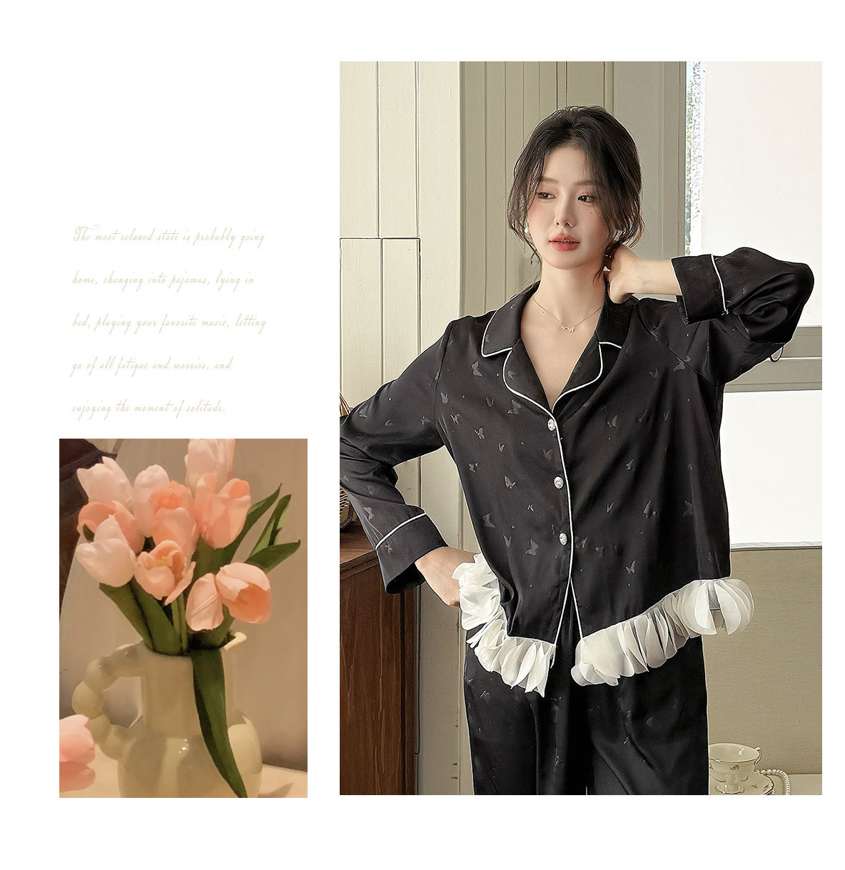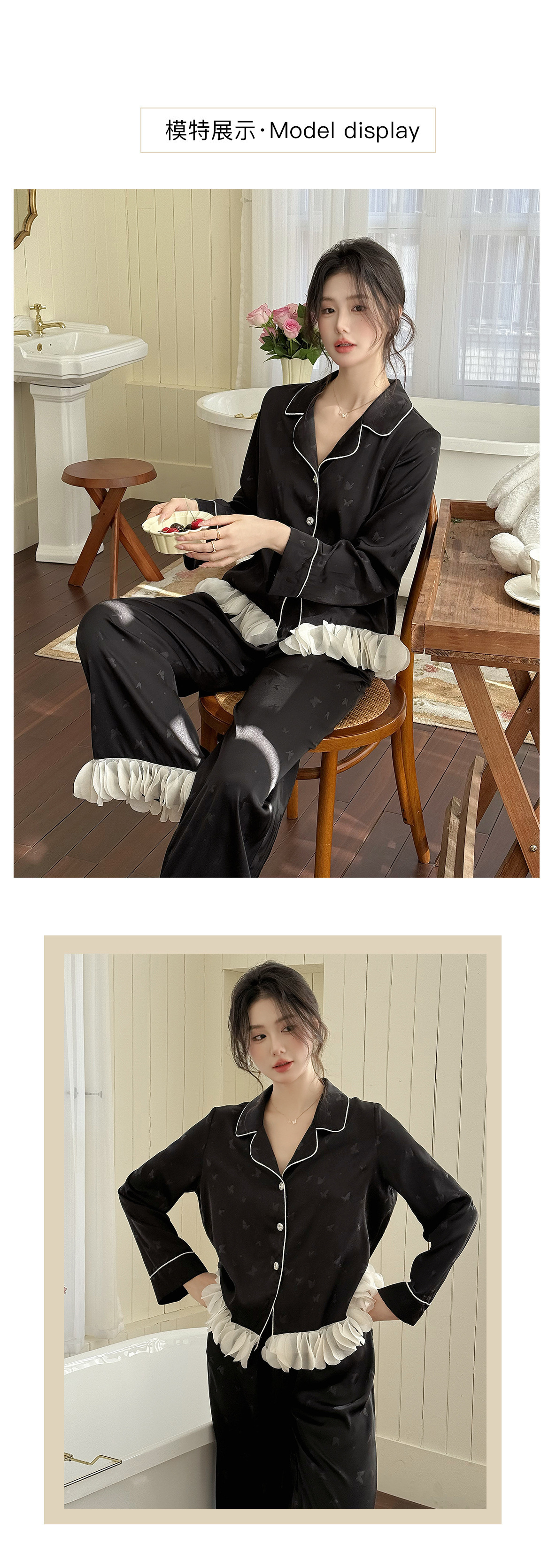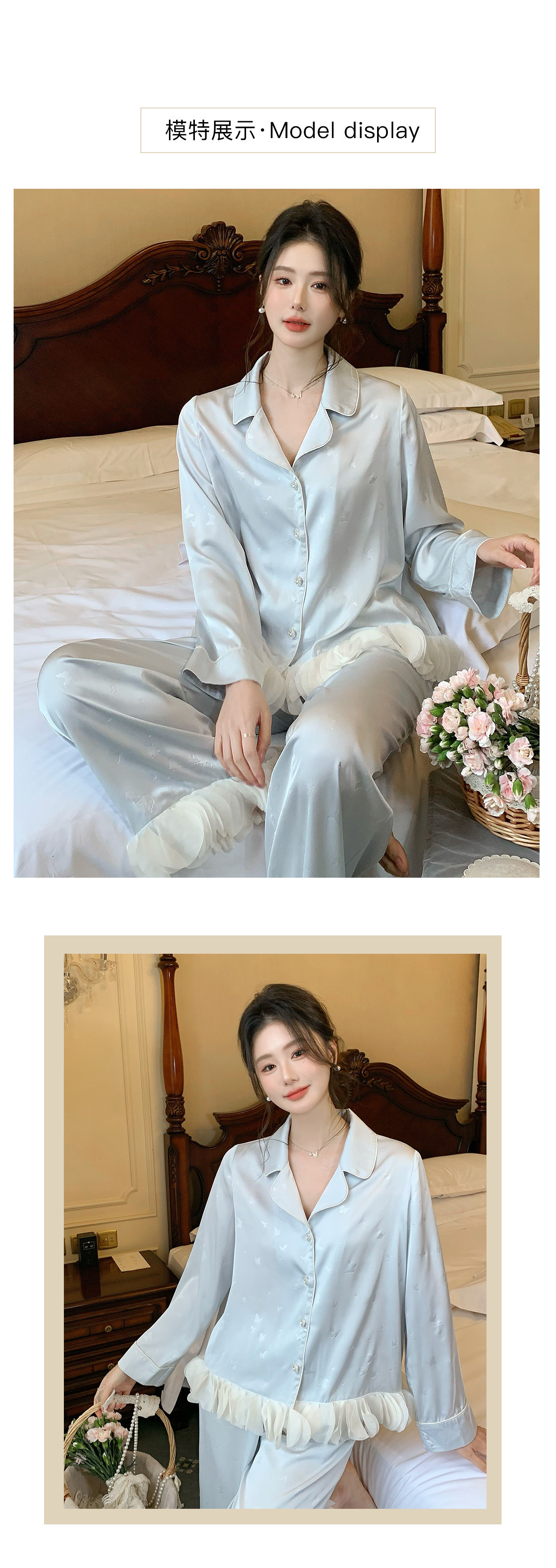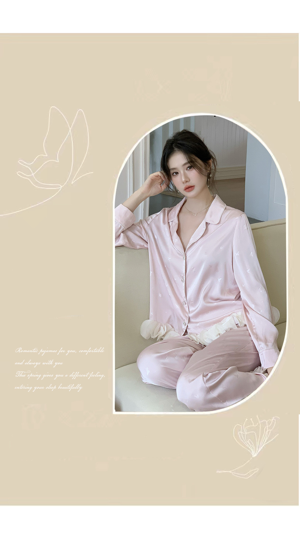 여성을위한 외부 착용 가능한 프랑스 스타일 새 잠옷 가을 얼음 실크 달콤한 공주 스타일 인쇄 긴팔 바지 정장 홈웨어