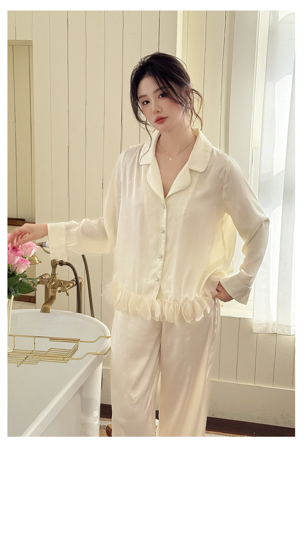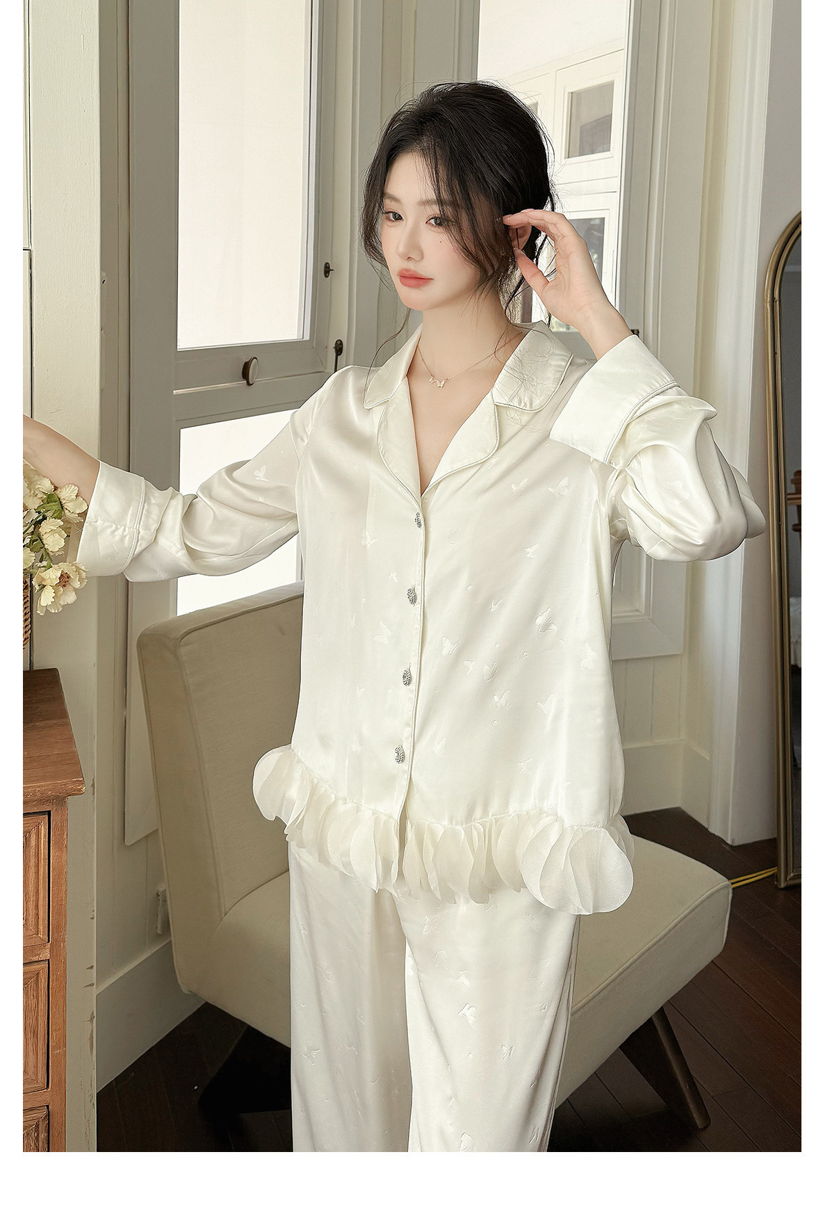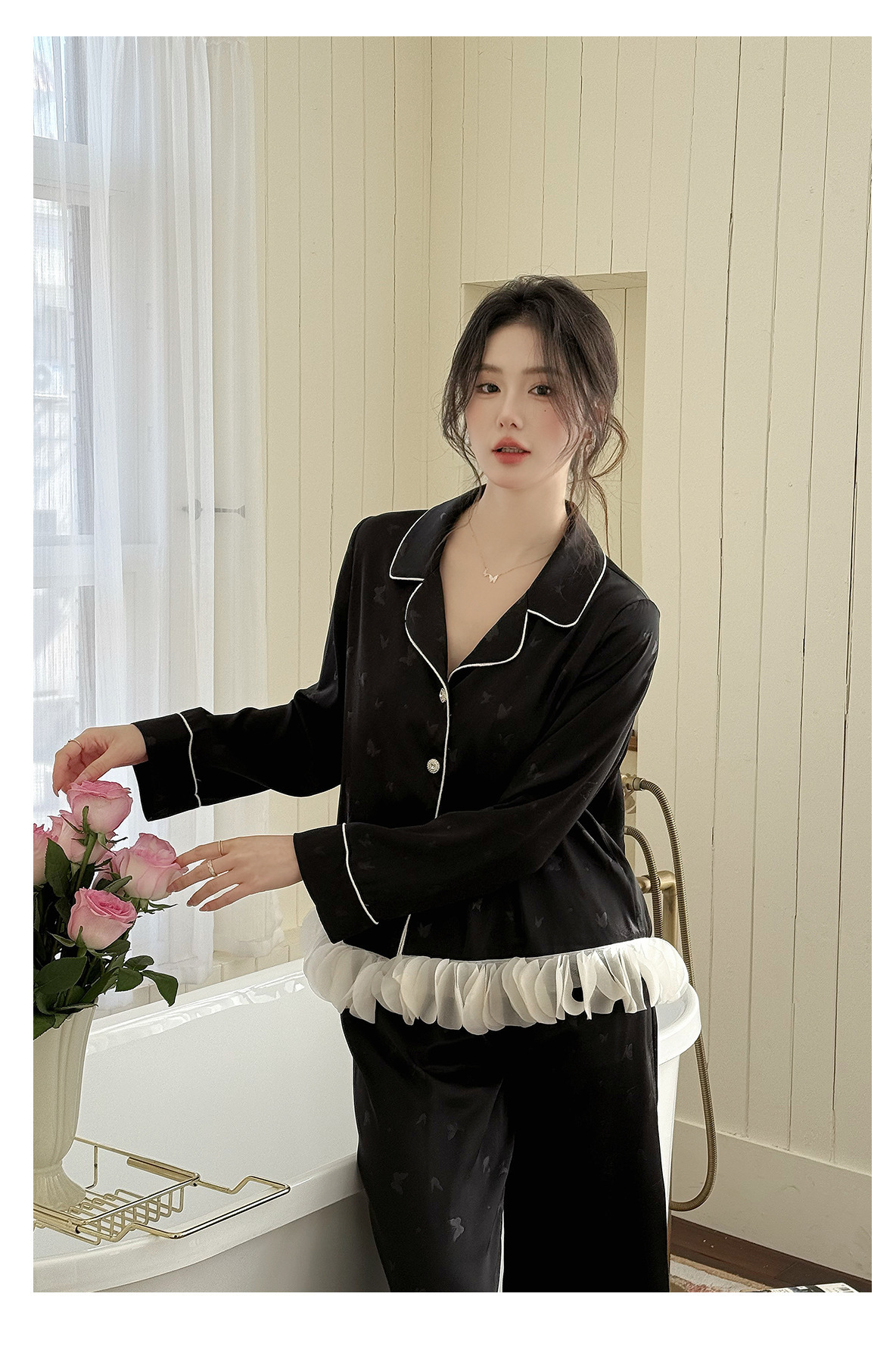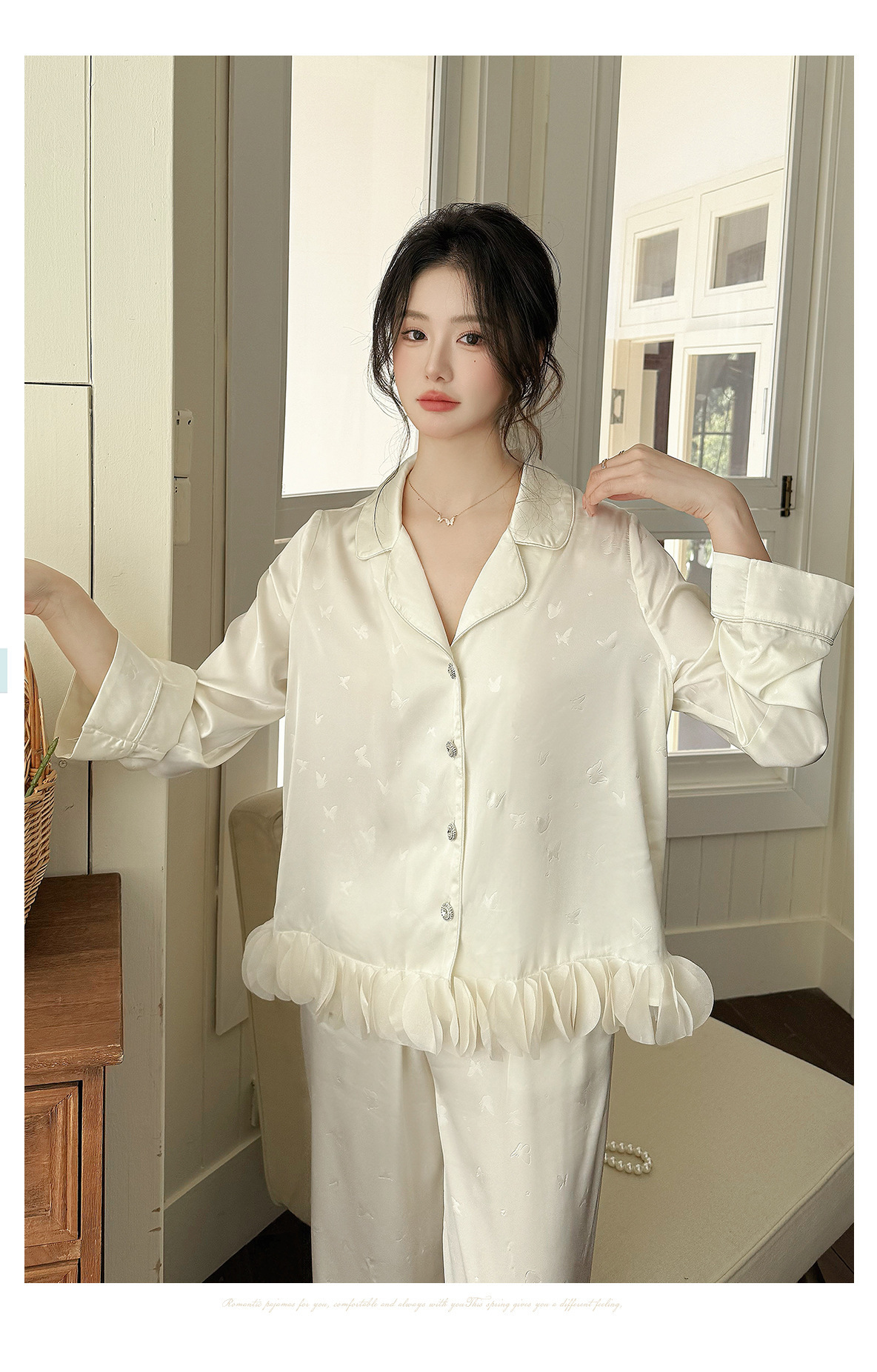 여성을위한 외부 착용 가능한 프랑스 스타일 새 잠옷 가을 얼음 실크 달콤한 공주 스타일 인쇄 긴팔 바지 정장 홈웨어