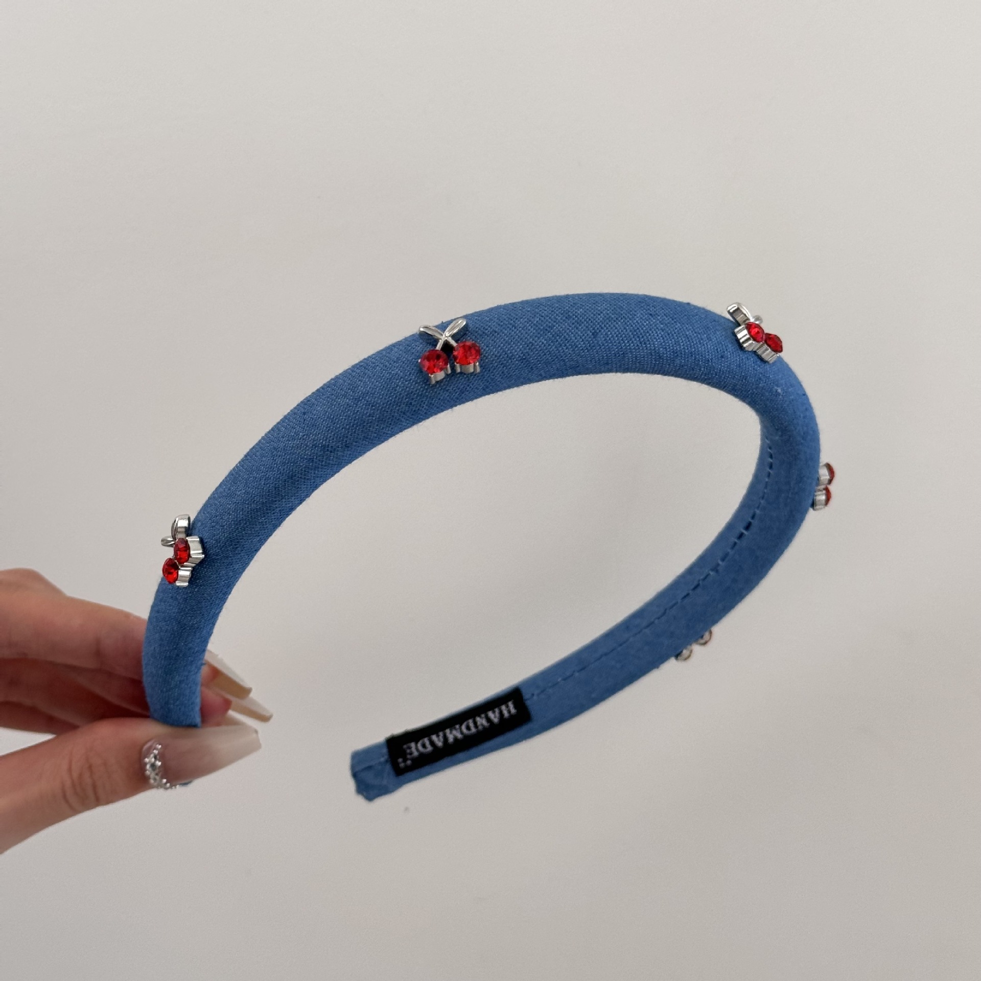 레트로 데님 블루 라인스톤 체리 디자인 헤드밴드 여성용 고급 헤드밴드 2025 새로운 스타일 심플하고 다재다능한 모자스토어 가기