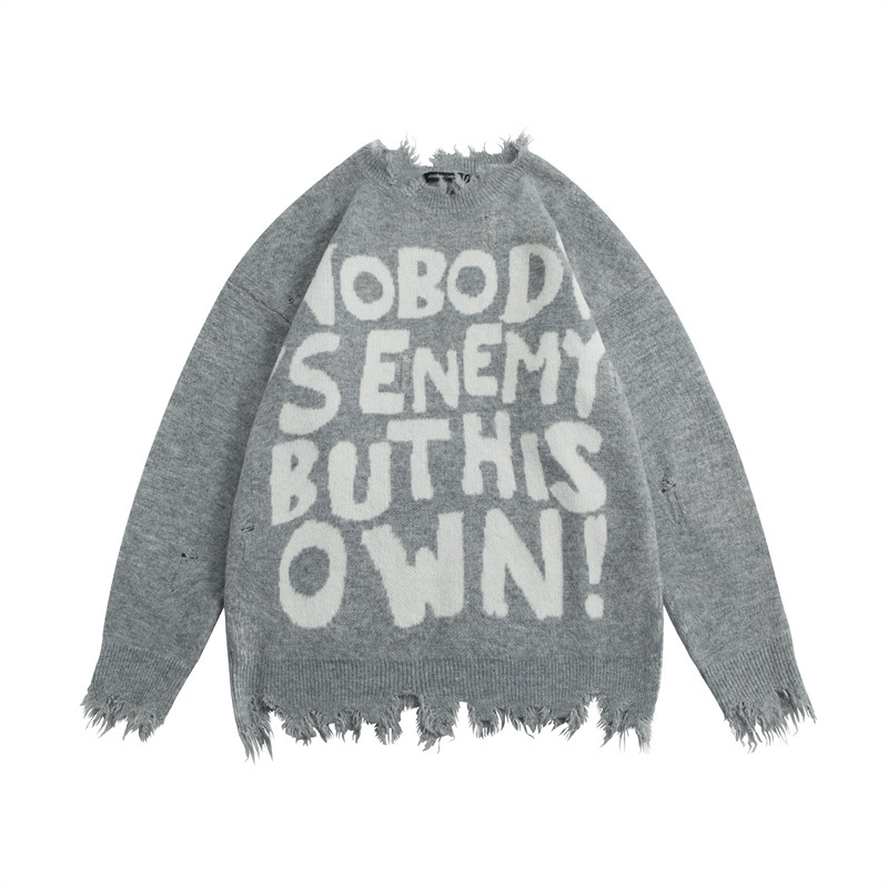 HeyHenry 스트리트 패션 디스트레스드 레터 자카드 로우 엣지 니트 풀오버 스웨터 커플 스웨터 소년 소녀용스토어 가기