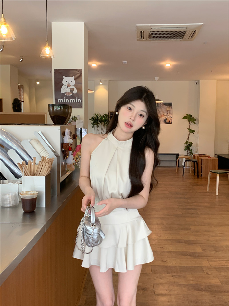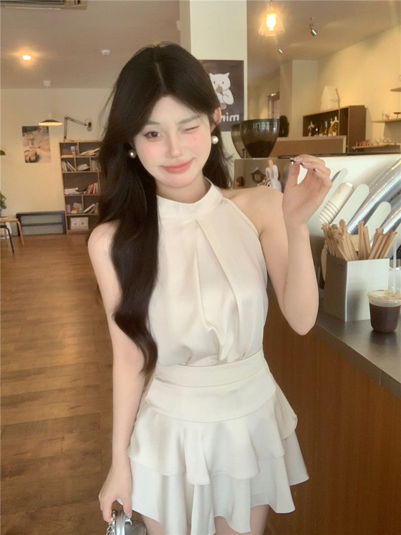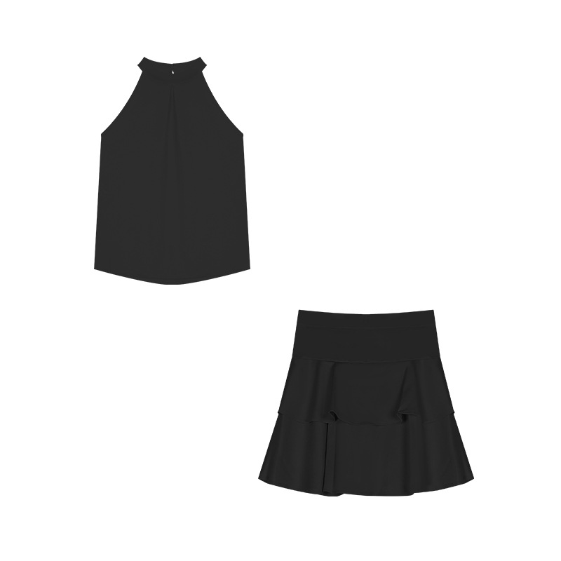 여름 여성용 살구색 새틴 홀터넥 탑, 하이웨이스트 스커트, A라인 스커트, 투피스 세트