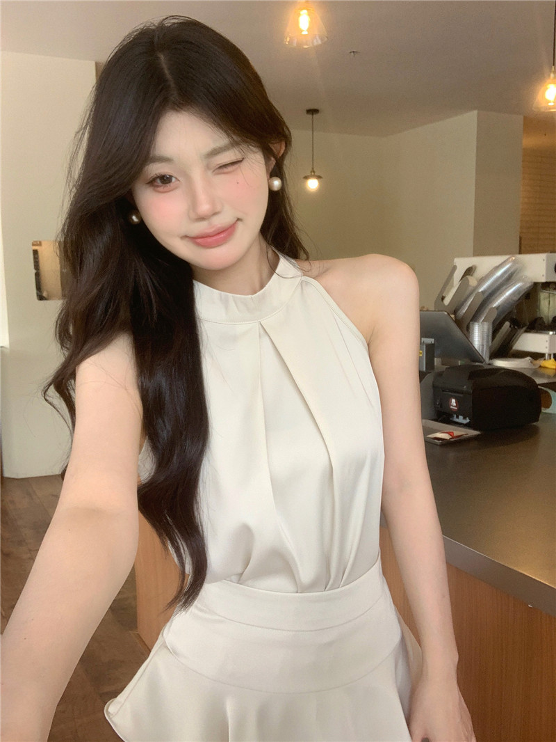 여름 여성용 살구색 새틴 홀터넥 탑, 하이웨이스트 스커트, A라인 스커트, 투피스 세트스토어 가기