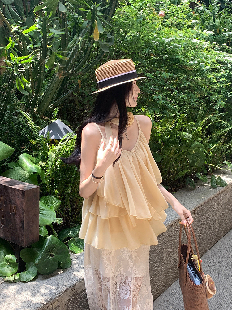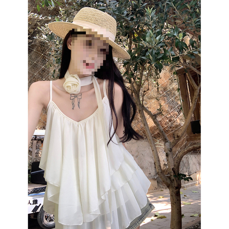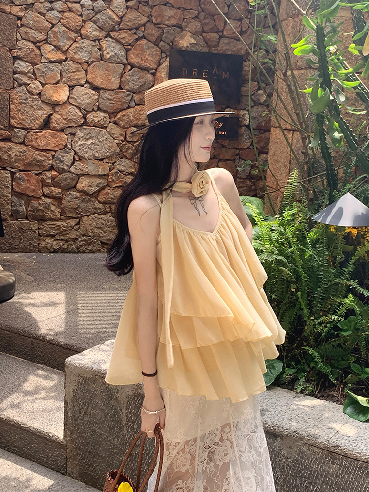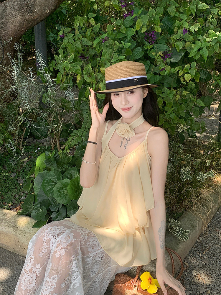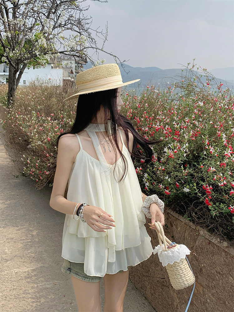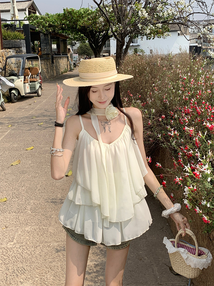 리조트 스타일 쉬폰 서스펜더 탑 2025 여름 신작 달콤한 핫걸 슬리밍 및 연령 감소 셔츠 시크 셔츠