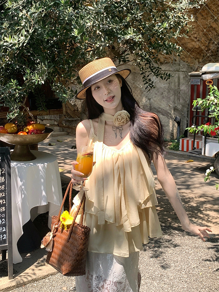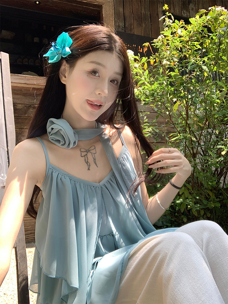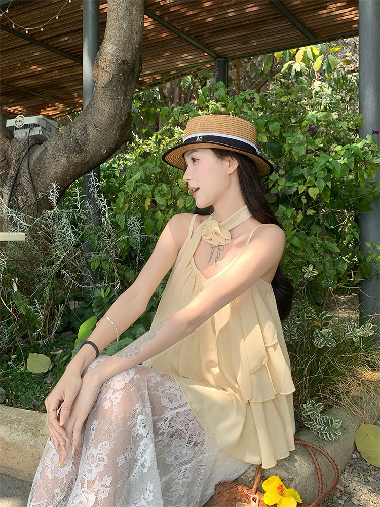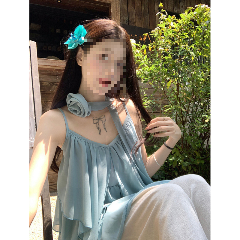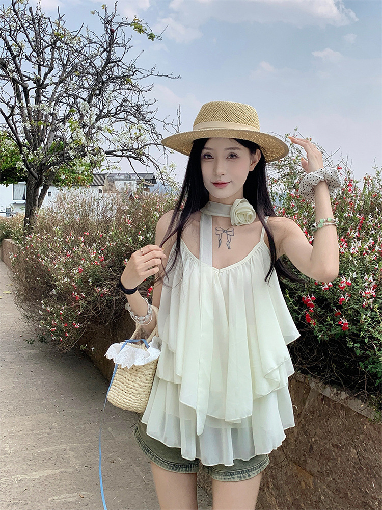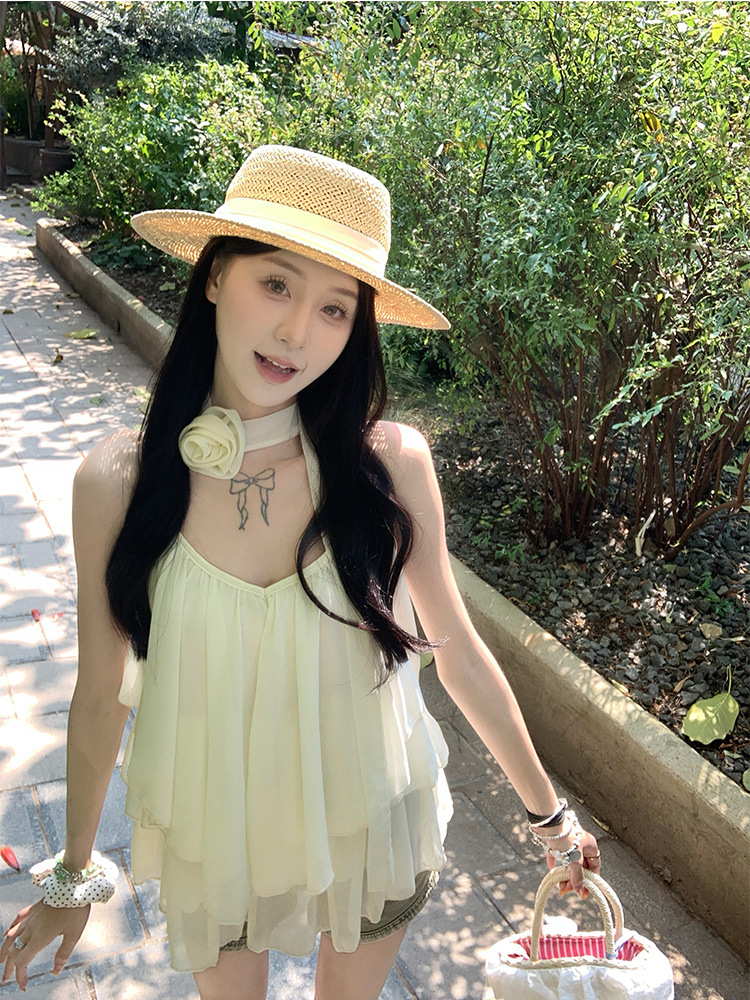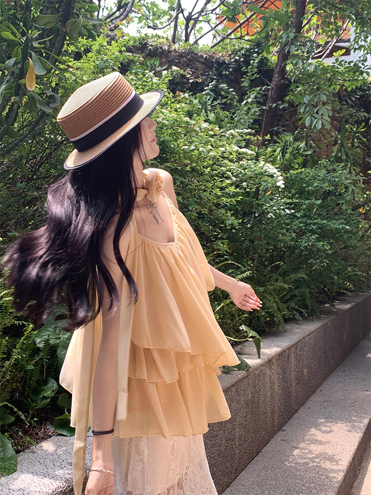 리조트 스타일 쉬폰 서스펜더 탑 2025 여름 신작 달콤한 핫걸 슬리밍 및 연령 감소 셔츠 시크 셔츠