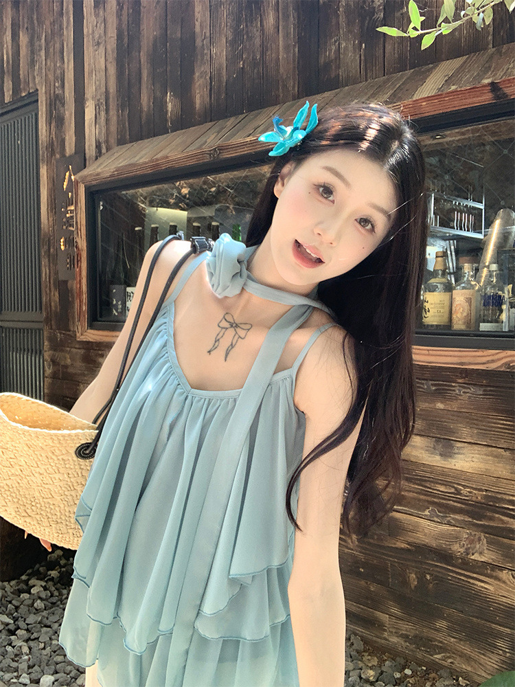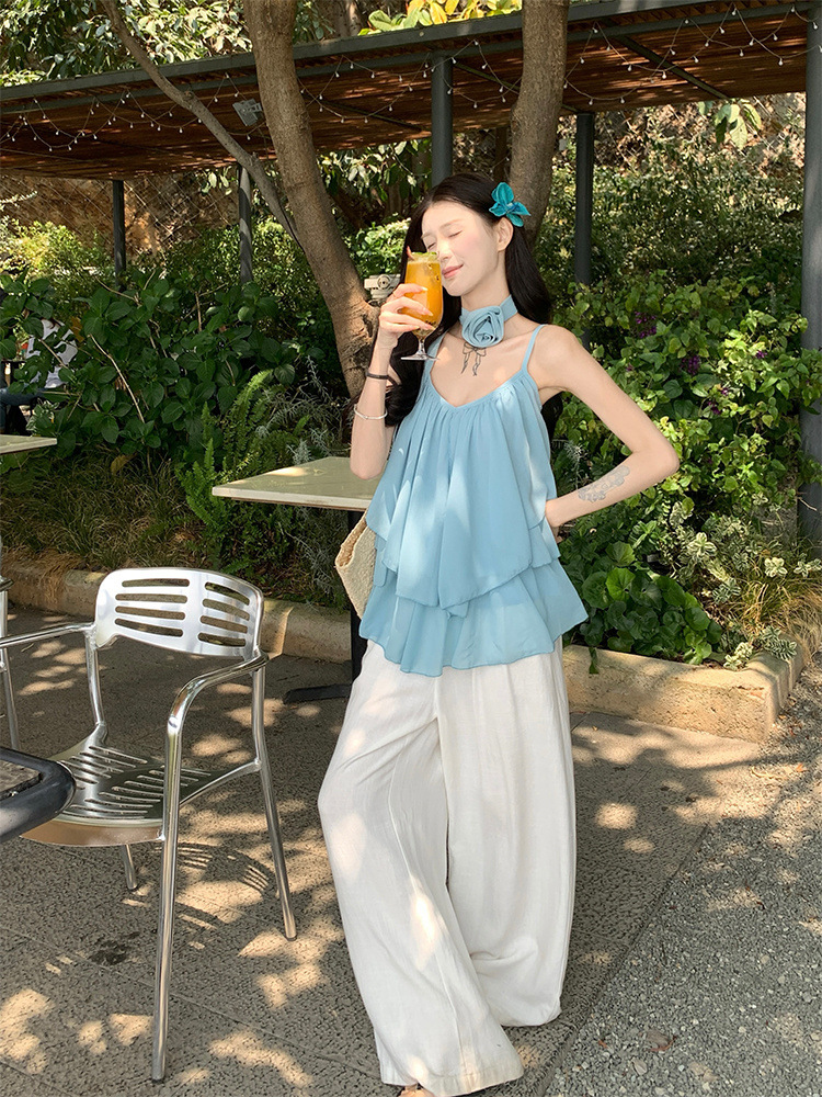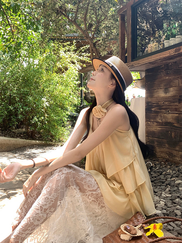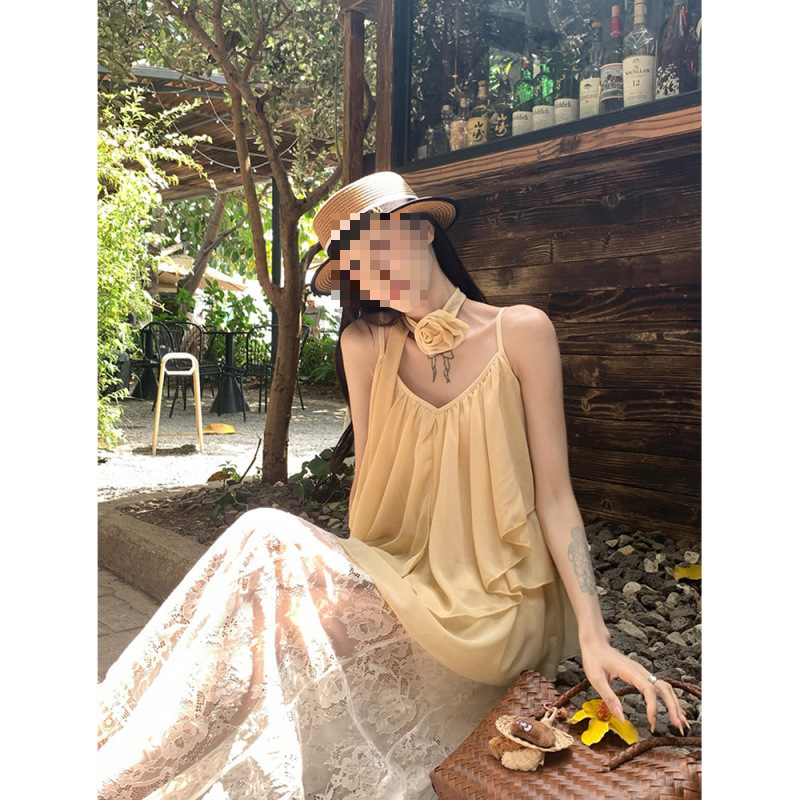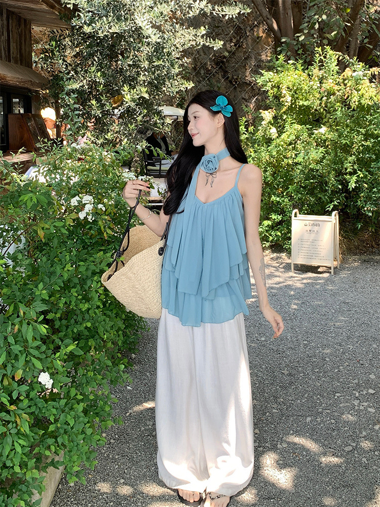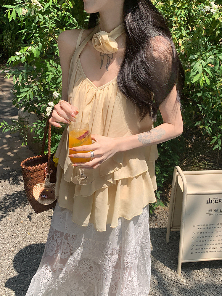리조트 스타일 쉬폰 서스펜더 탑 2025 여름 신작 달콤한 핫걸 슬리밍 및 연령 감소 셔츠 시크 셔츠