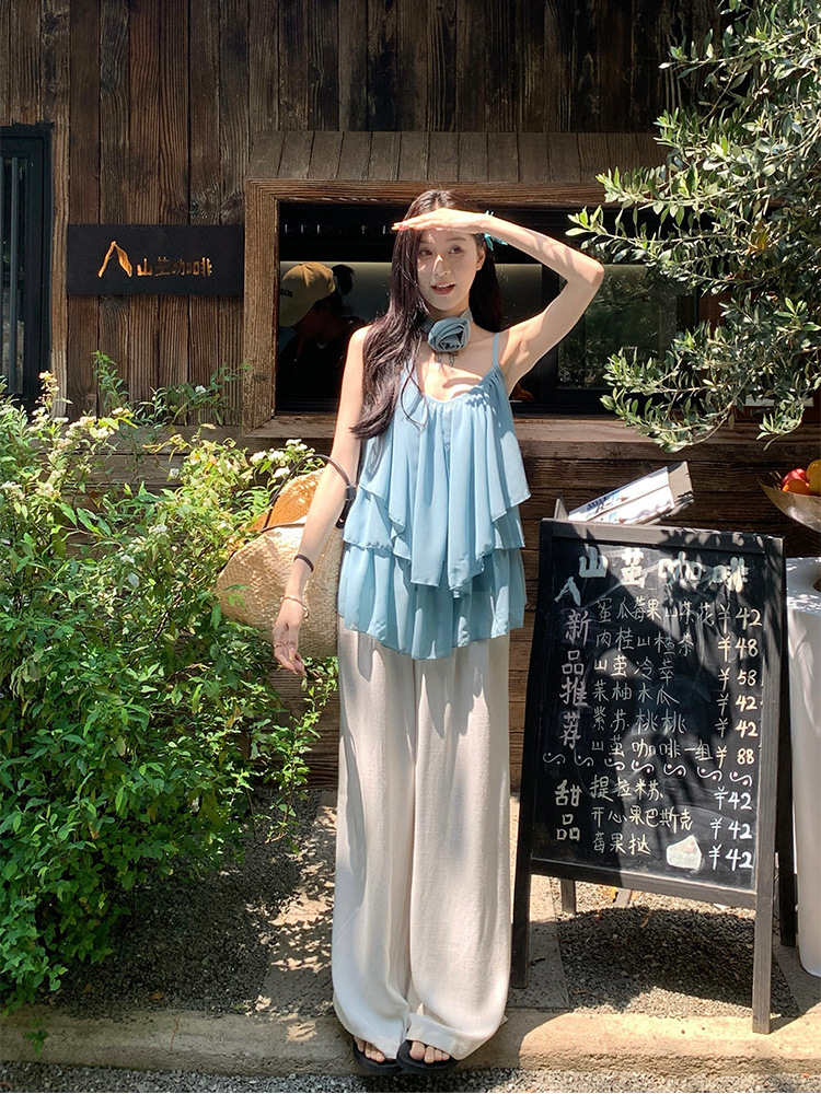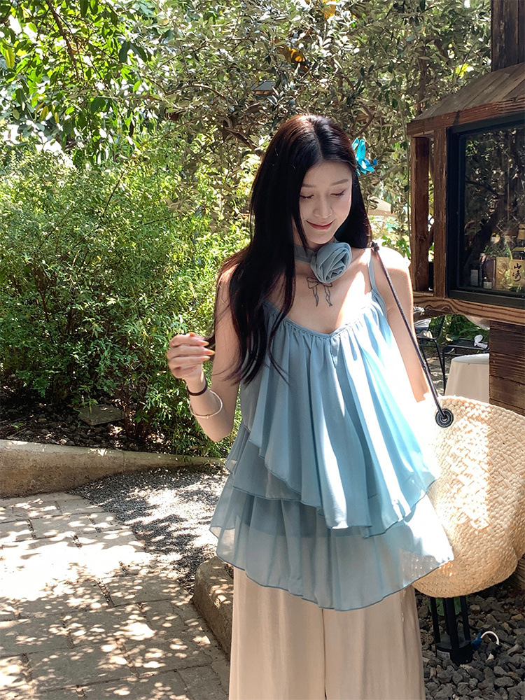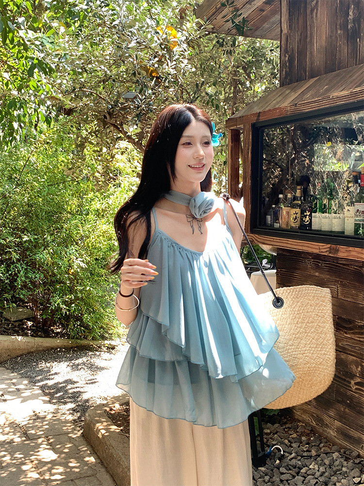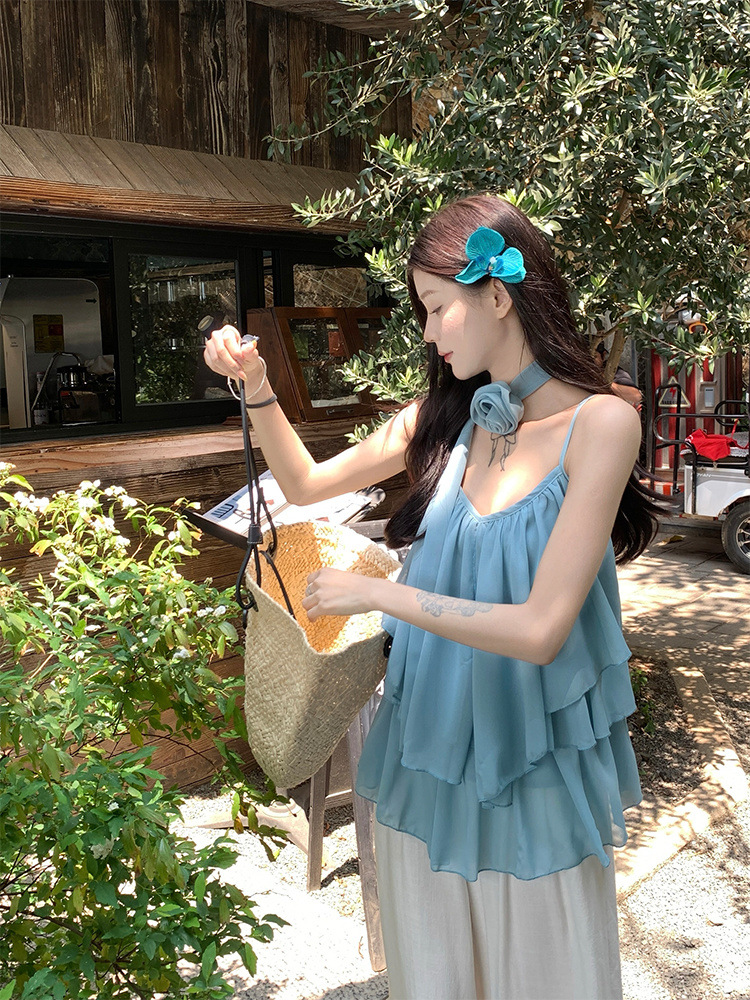 리조트 스타일 쉬폰 서스펜더 탑 2025 여름 신작 달콤한 핫걸 슬리밍 및 연령 감소 셔츠 시크 셔츠스토어 가기