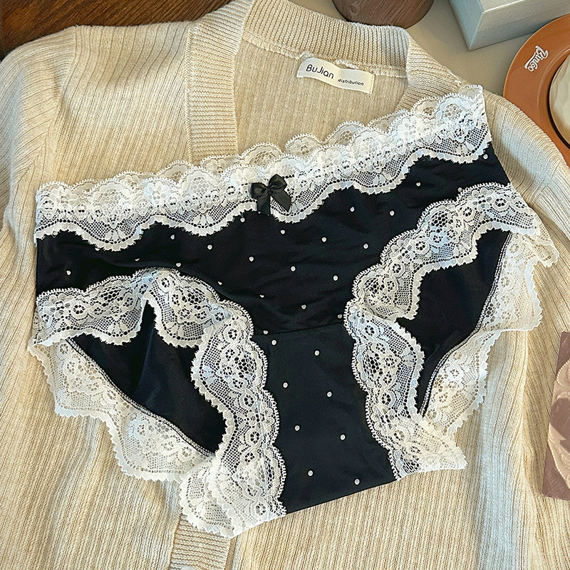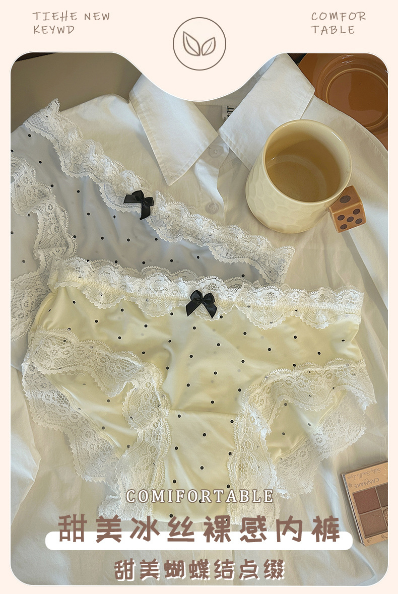 여름 얼음 실크 원활한 중간 허리 소녀 속옷 순수한 욕망 나비 매듭 레이스 얇은 통기성 폴카 도트 팬티
