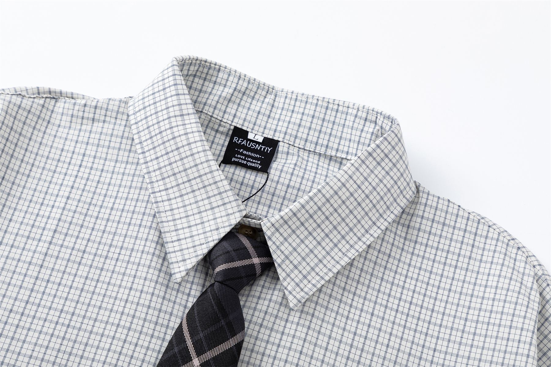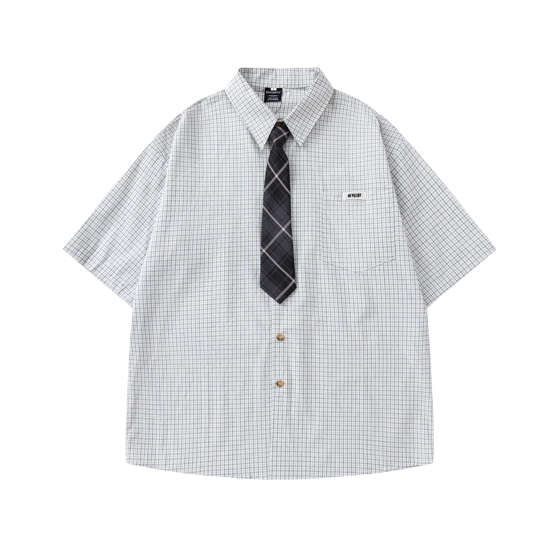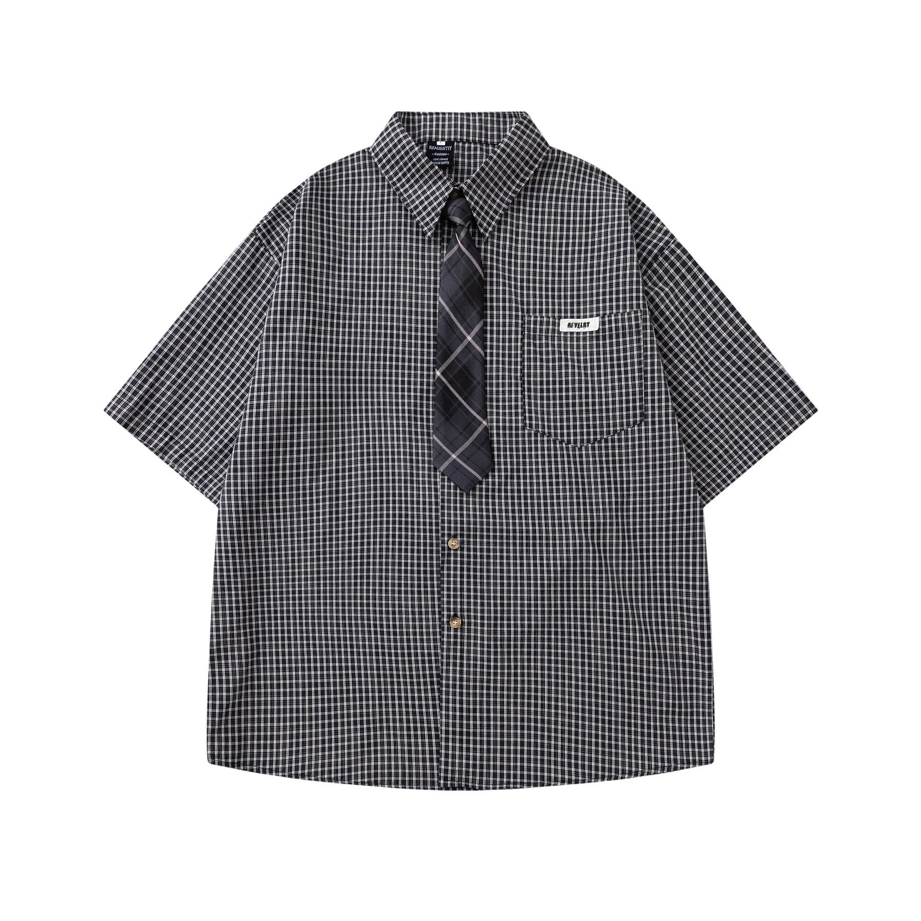 일본 복고풍 격자 무늬 넥타이 반팔 셔츠 남성 여름 대학 스타일 커플 격자 무늬 느슨한 캐주얼 트렌디 셔츠